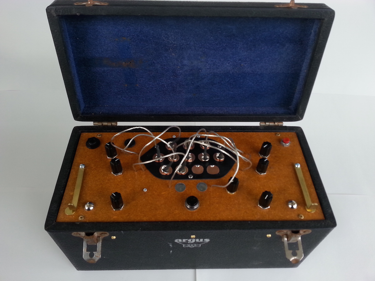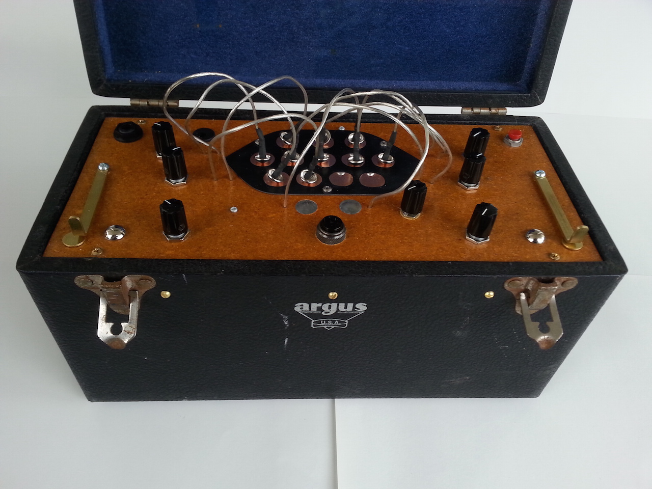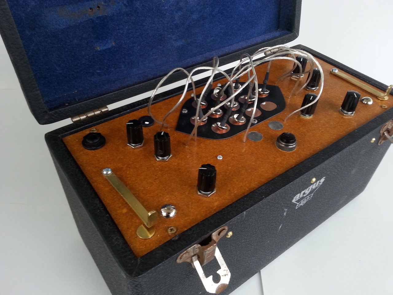 Here is a new Bug work, 4 reconfigurable magneticly patchable knobs let you connect through the hand etched patchbay. The Bug's controls let you create and tune a field of glitch based noise and sonic splatter. This piece Features 4 magnetically patchable kobs that let you tune each connection, 2 strobing light patches for intermittent sound and juggeling, Power starve knob, global tune, Activate and Freeze "button/switches",Reset button,red lamp, and a 1/4 out. Housed in a antique projector case!