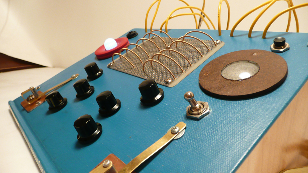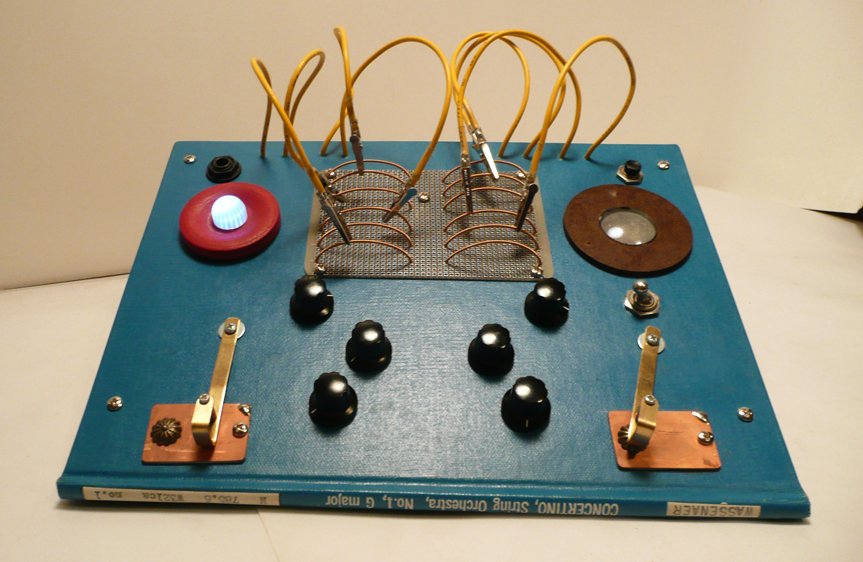 The Book of sound 2 Is a early book of sound with a custom alligator clip patch bay. There have been several of the books built. Constructed into a custom modified music book .