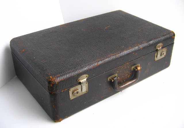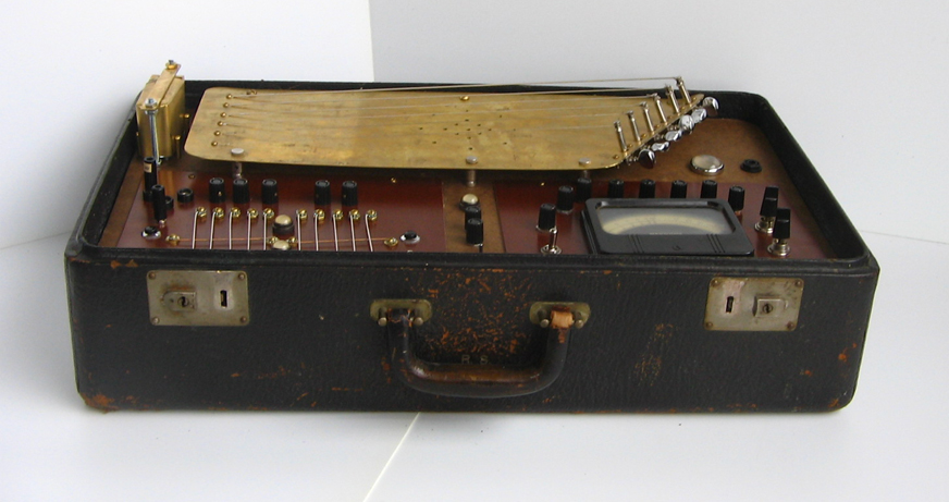 The string section you see on the left of the panel is the switch/button array. The buttons are extremely easy to press as we've allowed for less than 1/16" space for each...Tapping them lightly does the trick, or those connections can be switched to themselves or each other for a constant effect. Finally the delay signal runs into an amplifier and a speaker is mounted under the metal plate of the string section. The amp has controls for tone and volume and the speaker runs side by side with a 1/4" out. The addition of the speaker adds to the intention of the piece being an adjustable feedback machine. The housing for this piece is a vintage real leather case with removable lid.