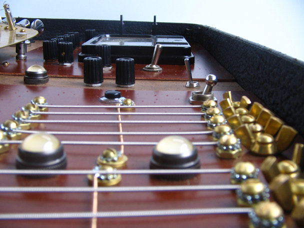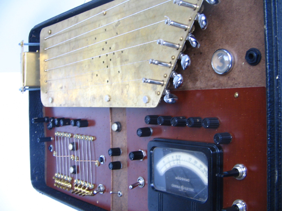 We intended for this piece to feedback controllably, to be sampled and altered in as many ways as we could think of...The result is an enormous mashup of sound with a very sweet undertone to it - with the added bonus of gritty possibilities. We designed the string section to feed through several circuits...First it runs side by side through an analog echo with controls for feedback, time, and, eq's and input levels... It has two two-way switches that shift pitch up or down or in combination, or knob to effect feedback and decay and a switch to filter some of that feedback. The output signal is a mix of the echo and the shifter.. Those signals are run into a much more high tech sampler delay circuit with a vast array of possibilities. About two seconds of delay, three primary delay times to choose from, and an entire switch/button array section that allows for thousands of possibilities to alter the function of the delay and fuck up sampled sounds to a great degree.