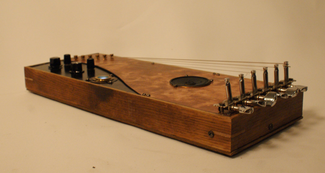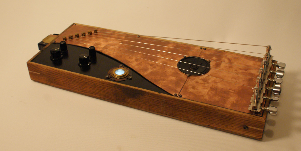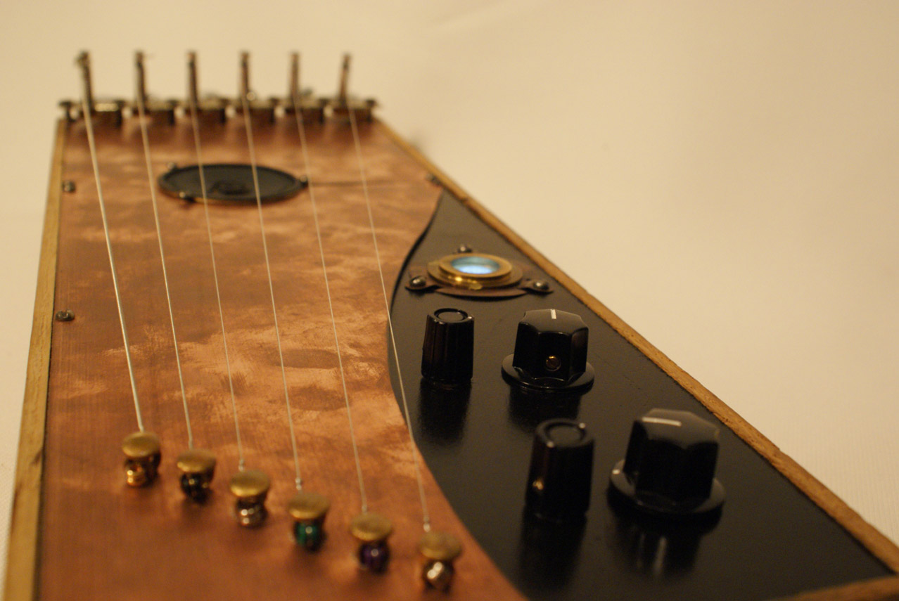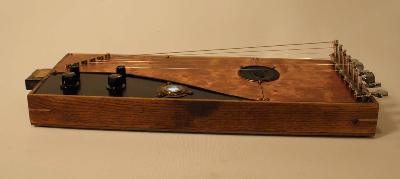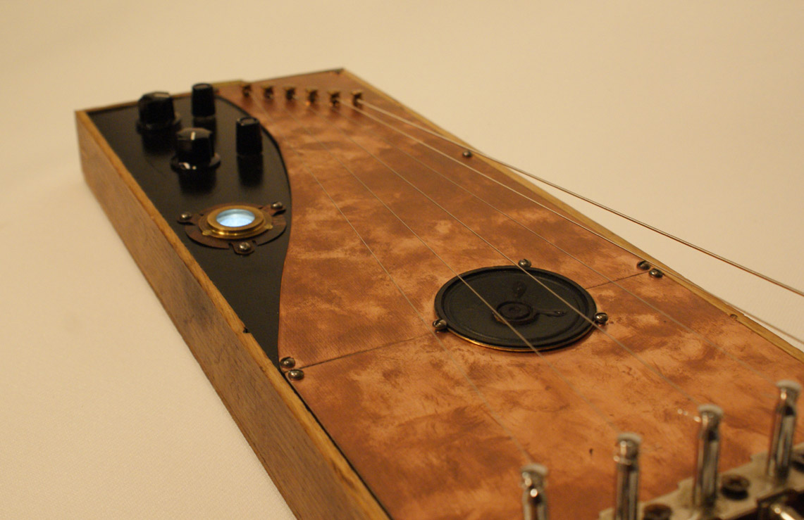 The Feedback Harmonizer by Arius Blaze. This particular piece features a contoured sound board. The feedback harmonizer is a feedback-based system with controls for delay and oscillator to create swelling drone based on the original notes. Would be best played with an ebow and slide - shown in the video with just straight plucking.