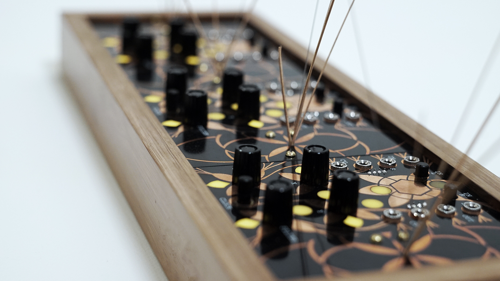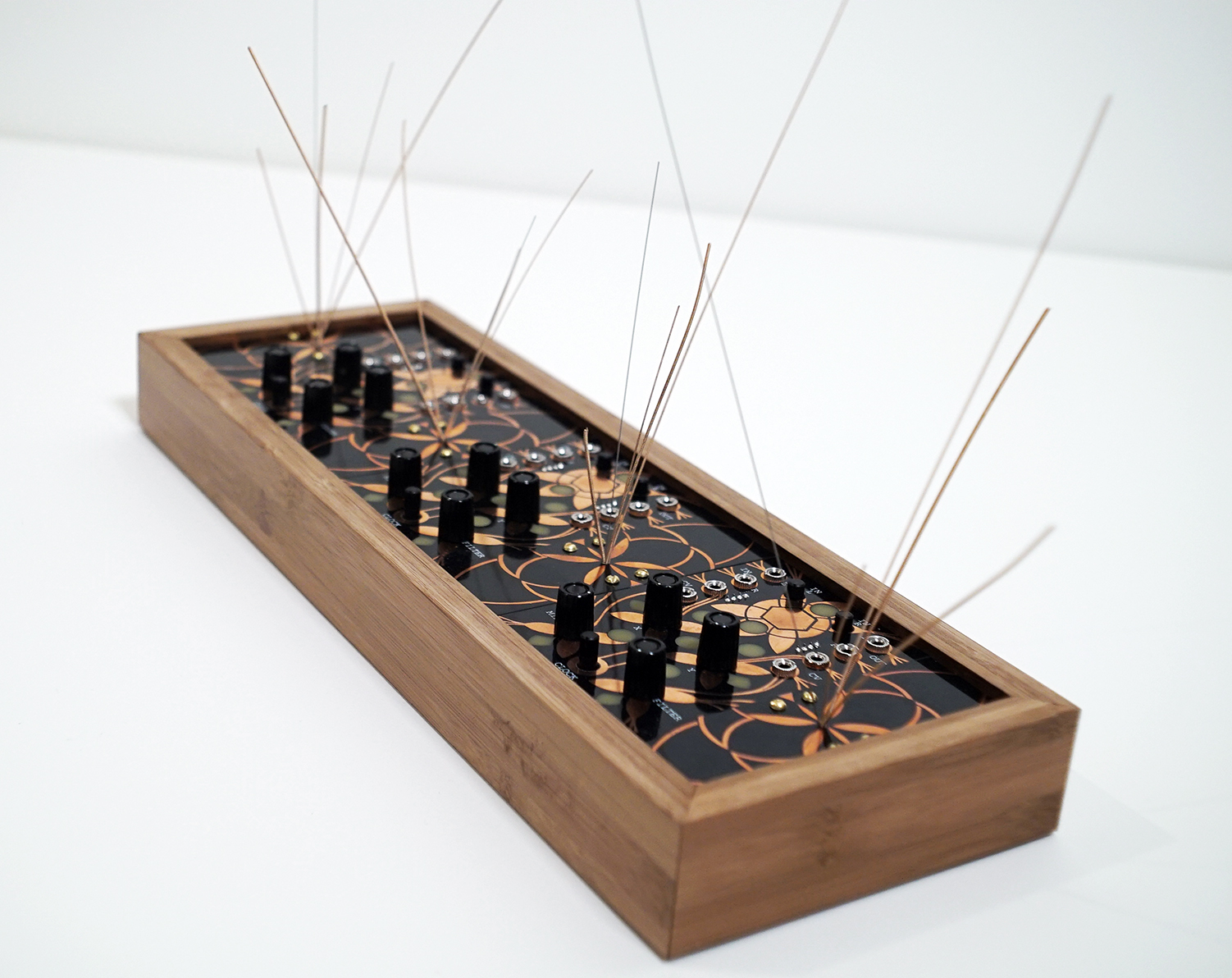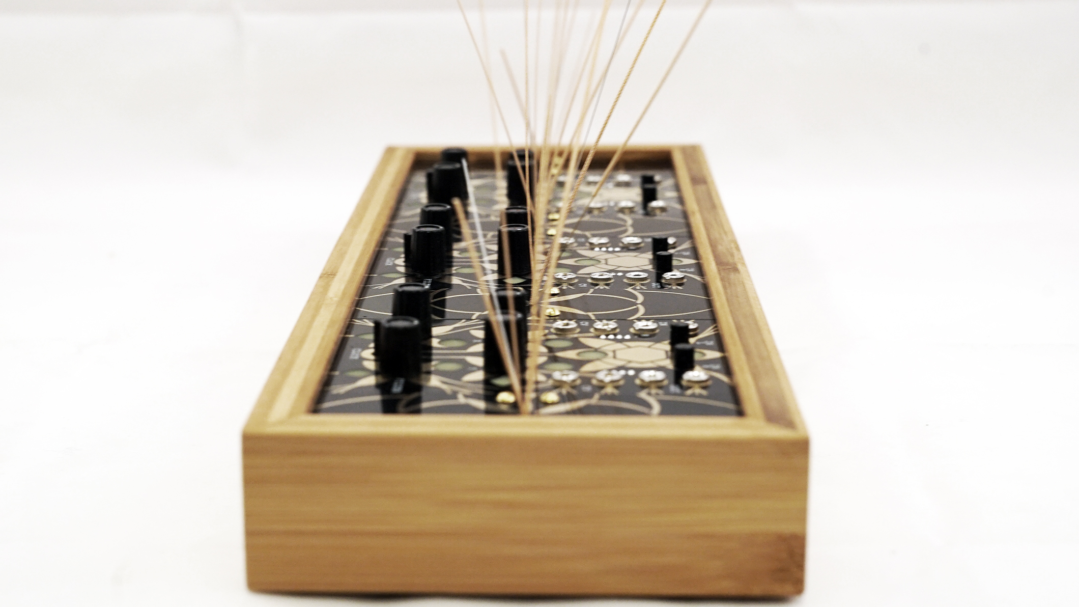 The design is simple but beautiful with all of the artwork created by Arius Blaze. The box is thick and heavy bamboo and the 1/8" thick panels are all inset firmly into a slot routed into the bamboo. This increases the resonant vibrations by adding tension to the garden panels. Each spout of strings is bolted in from the back and held in place with a panel under the main board.