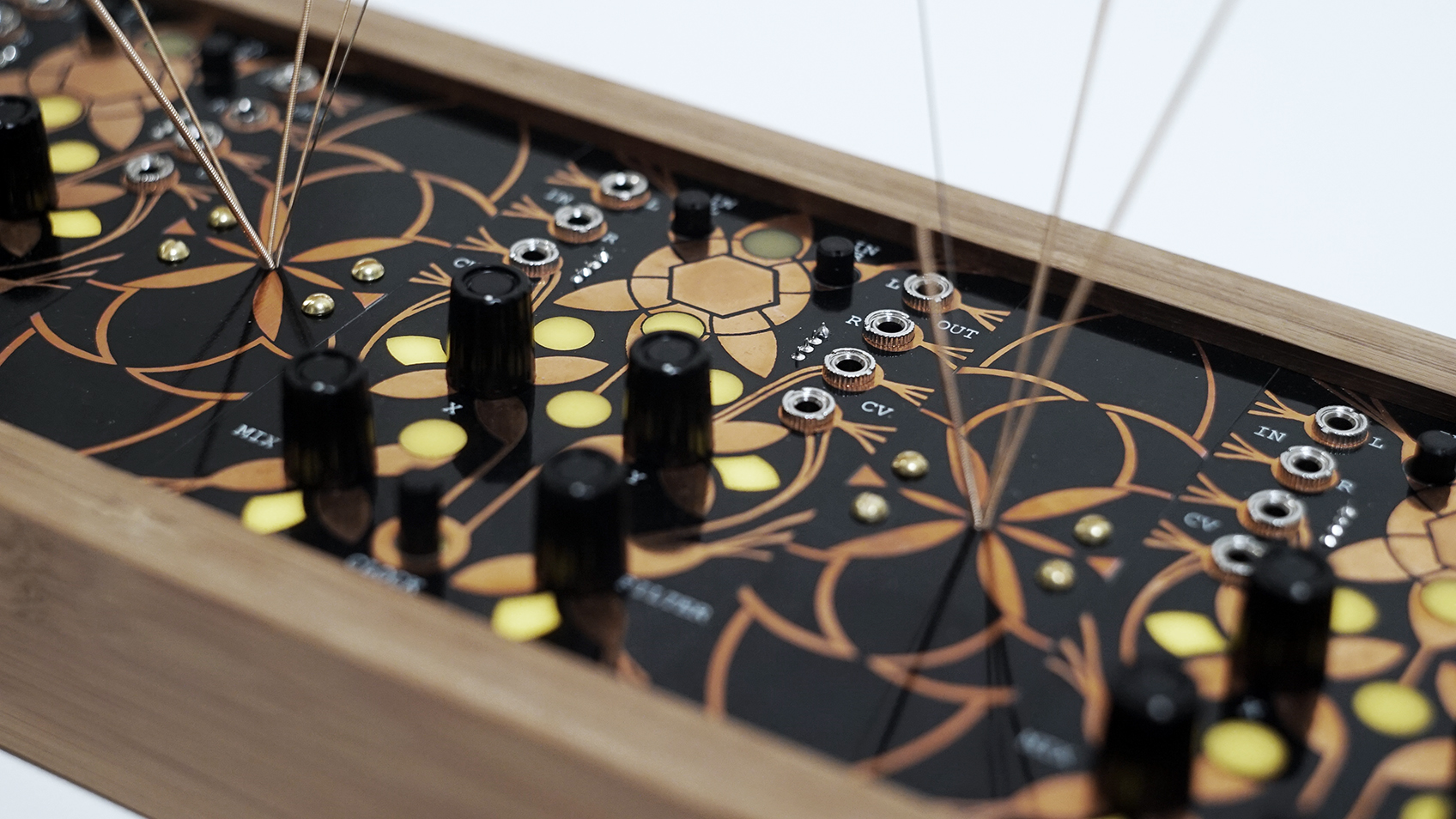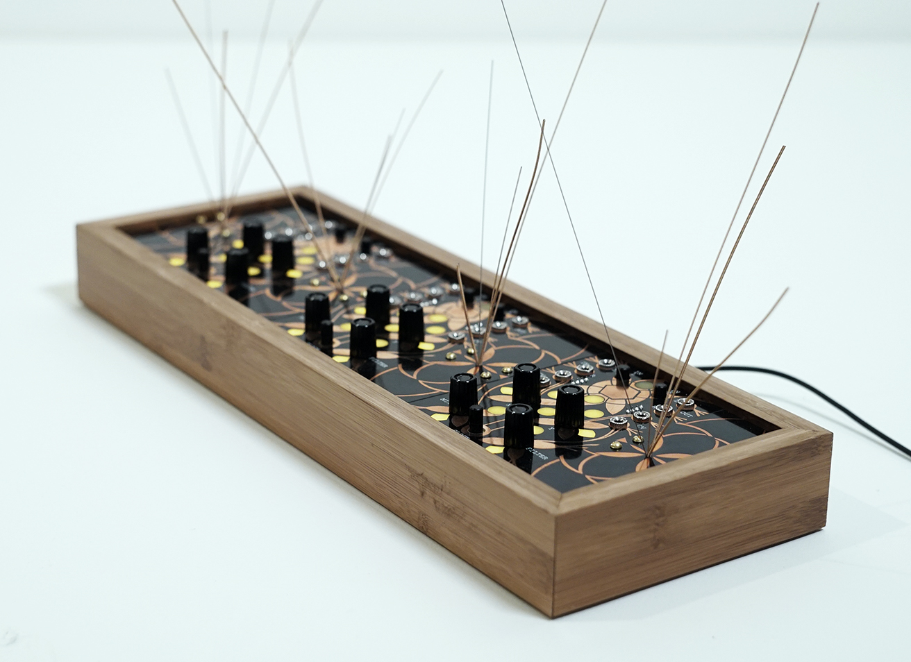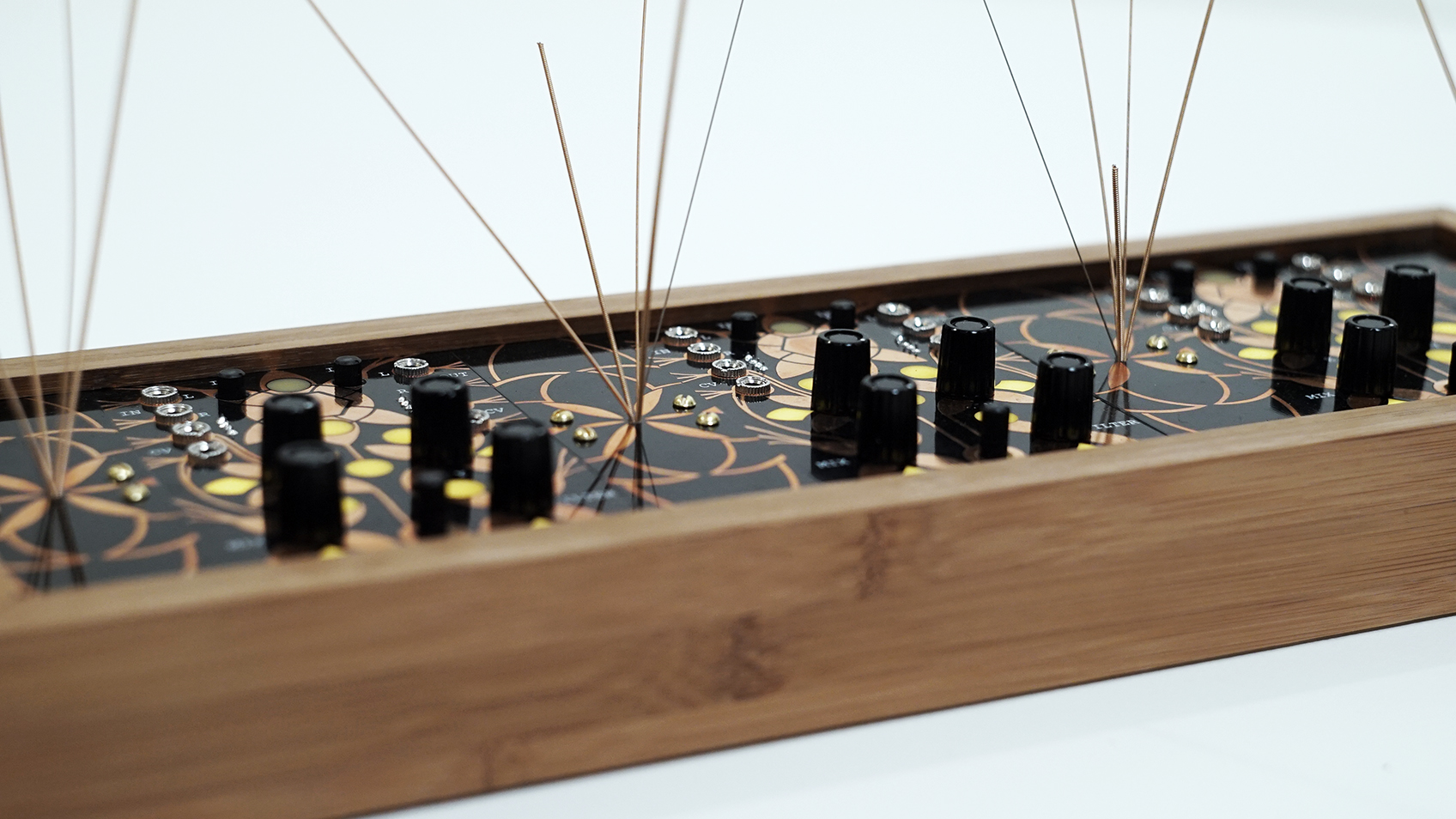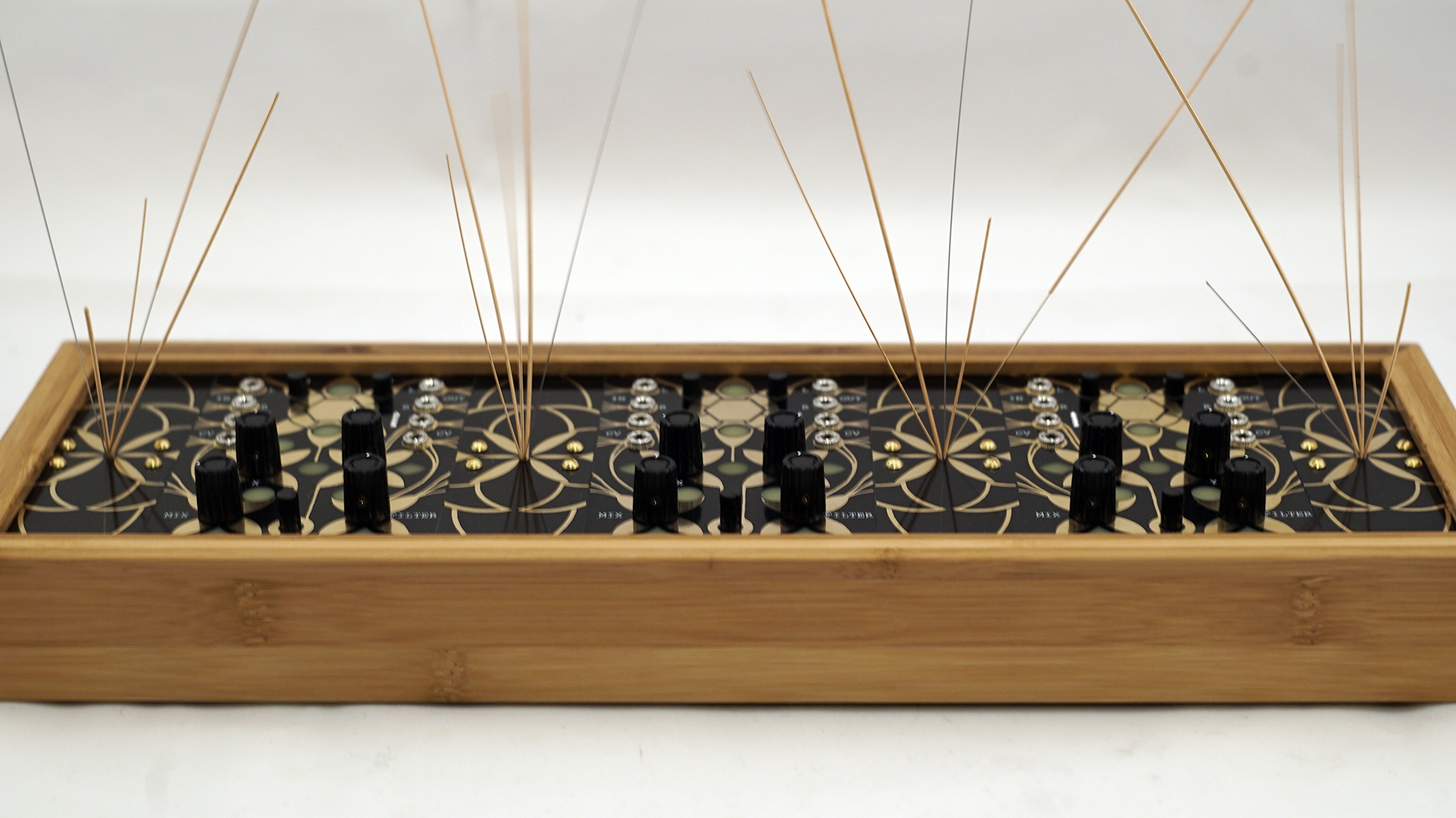The design is simple but beautiful with all of the artwork created by Arius Blaze. The box is thick and heavy bamboo and the 1/8" thick panels are all inset firmly into a slot routed into the bamboo. This increases the resonant vibrations by adding tension to the garden panels. Each spout of strings is bolted in from the back and held in place with a panel under the main board.