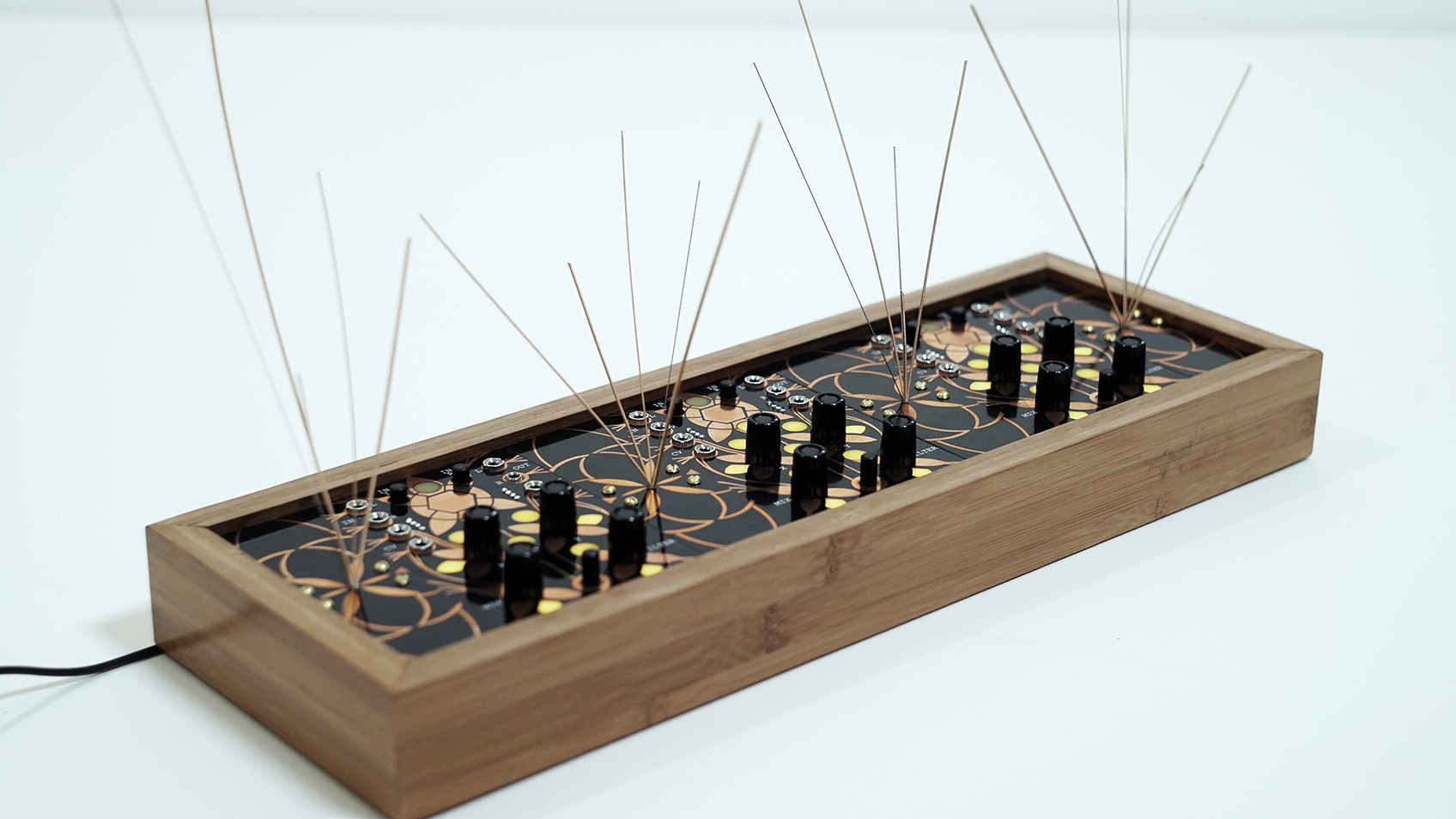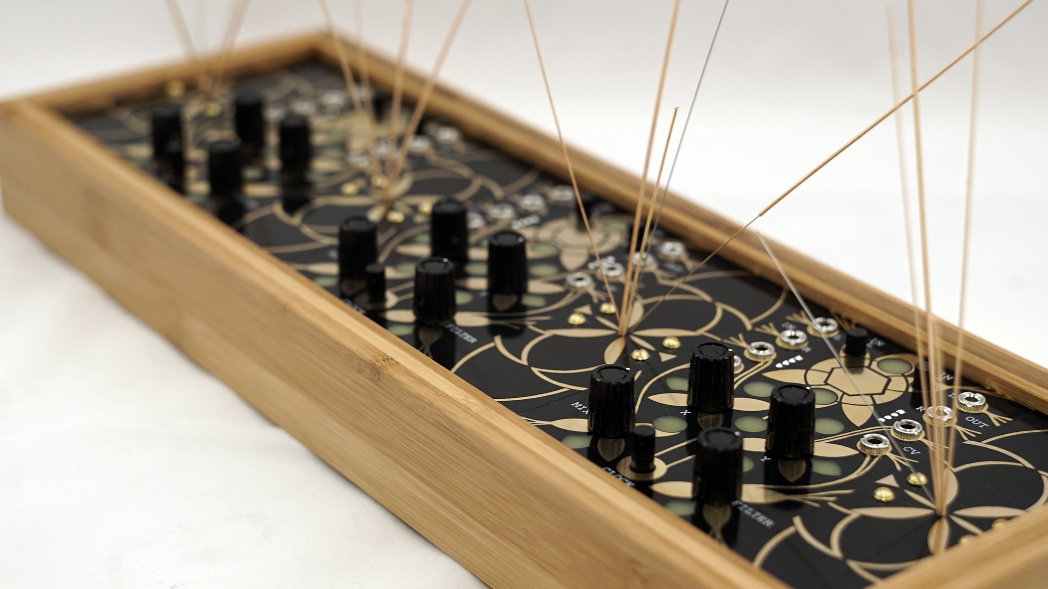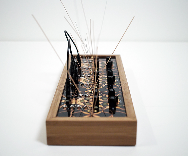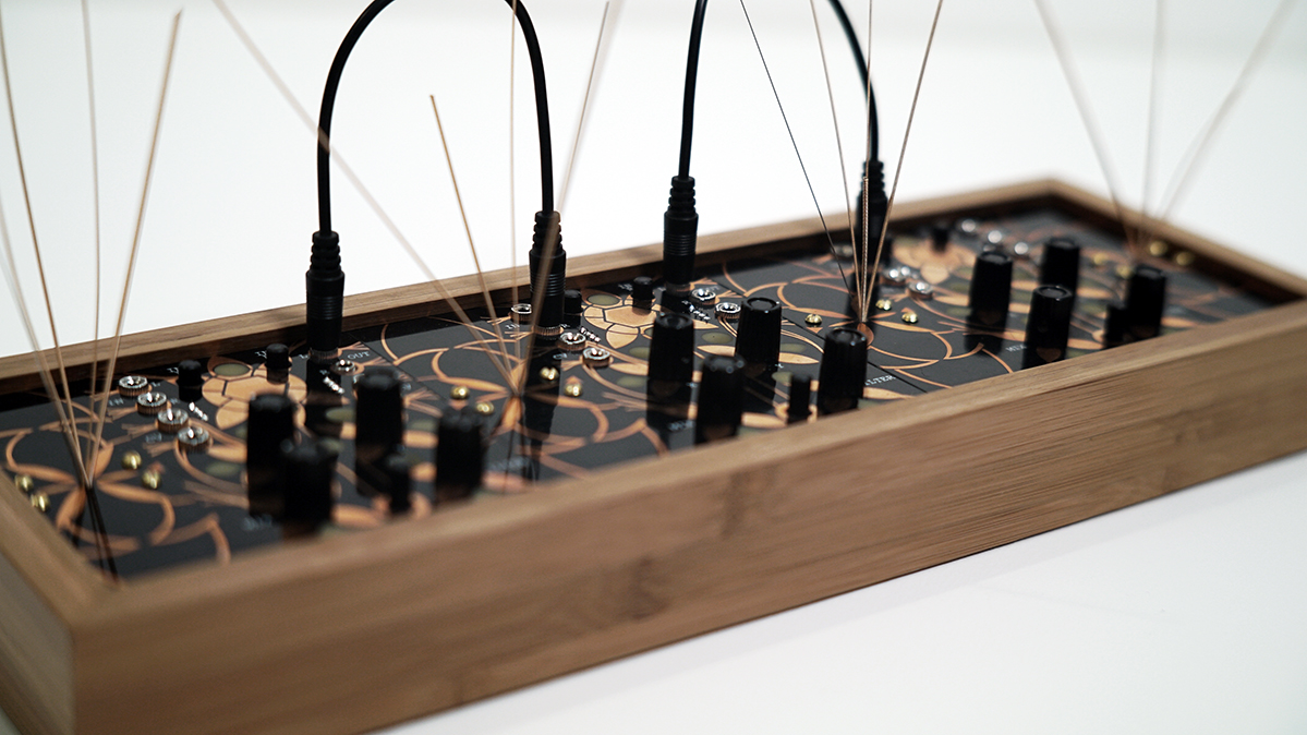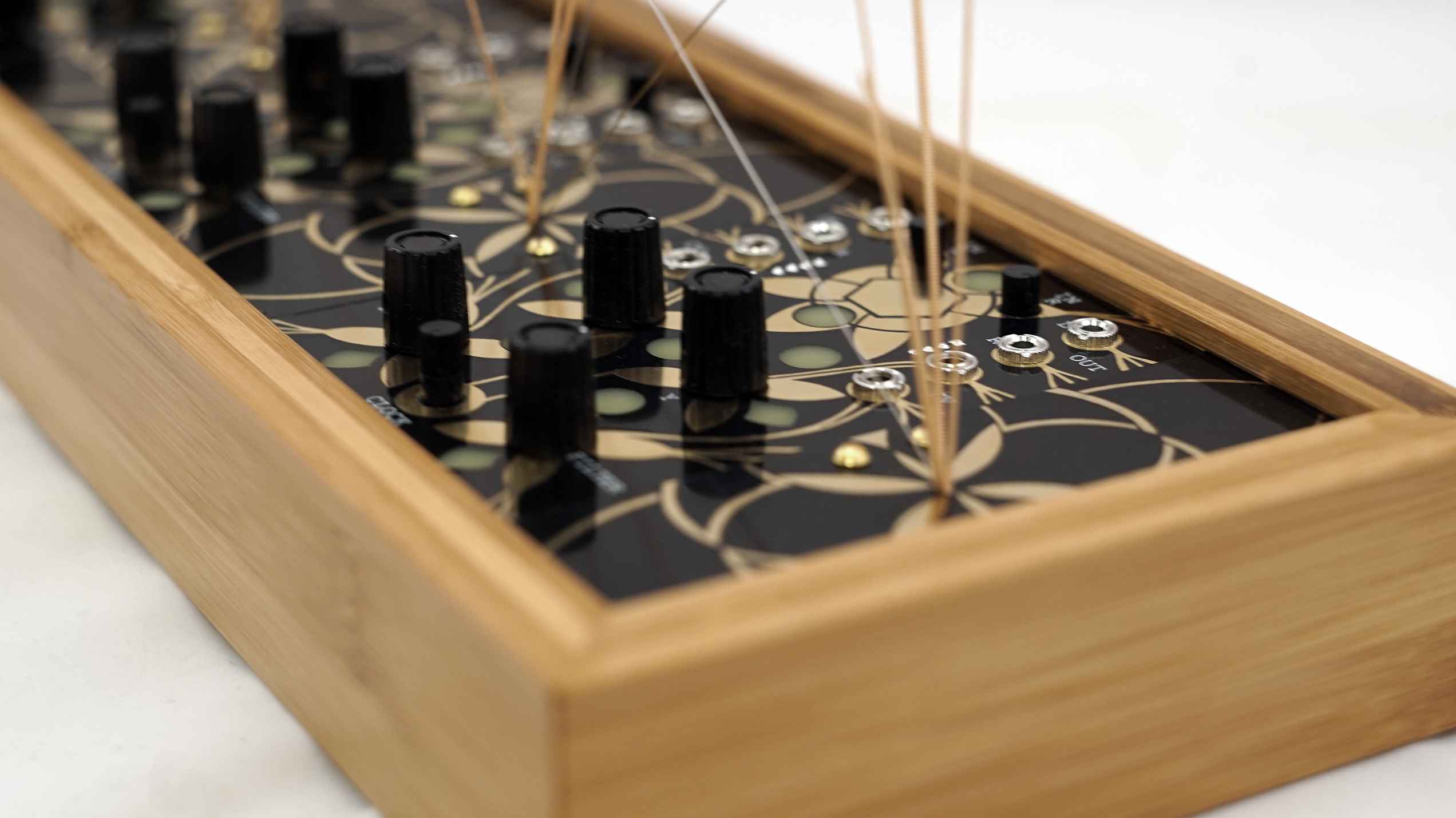 The garden essentially utilizes three Alter circuits but each equipped with a mic pre-amp, and 4 garden (stringed) panels for generating acoustics. By plucking, rubbing, tapping or even bowing, those micro-acoustic sounds become amplified and effected by the Alter in any number of ways. In essence, the garden is a large microphone designed to pick up vibrations.