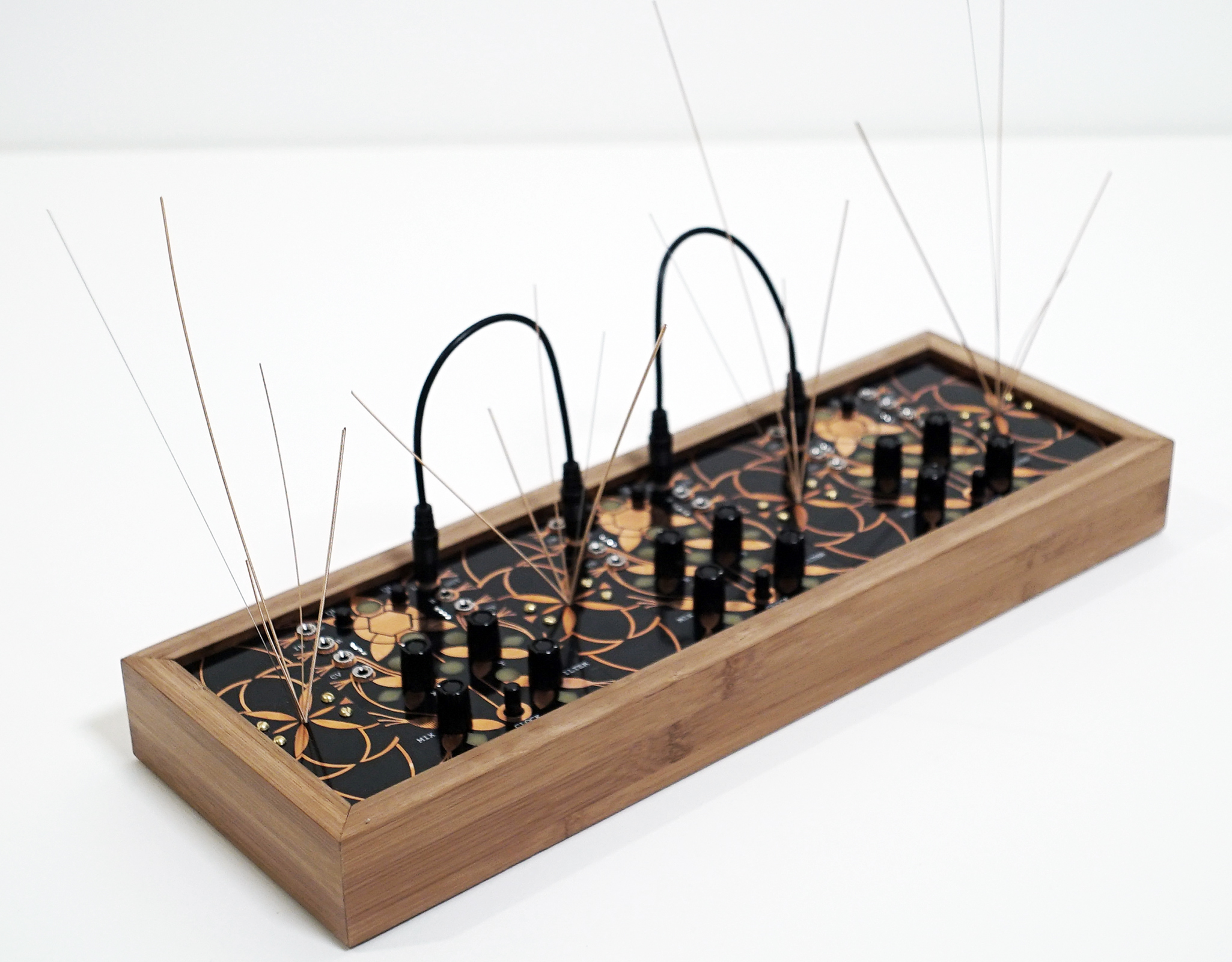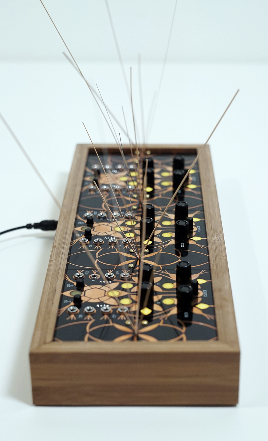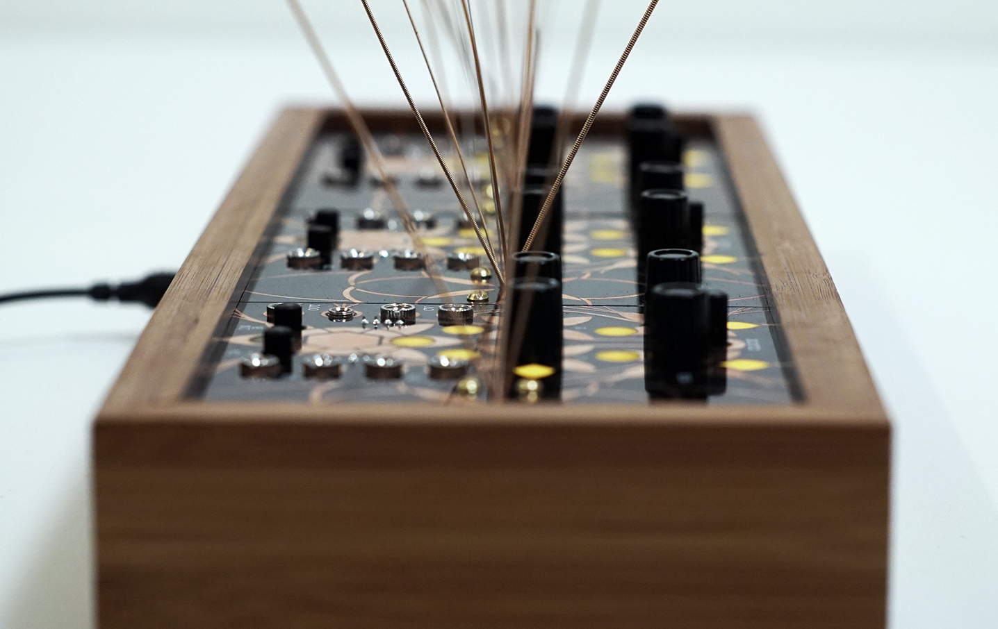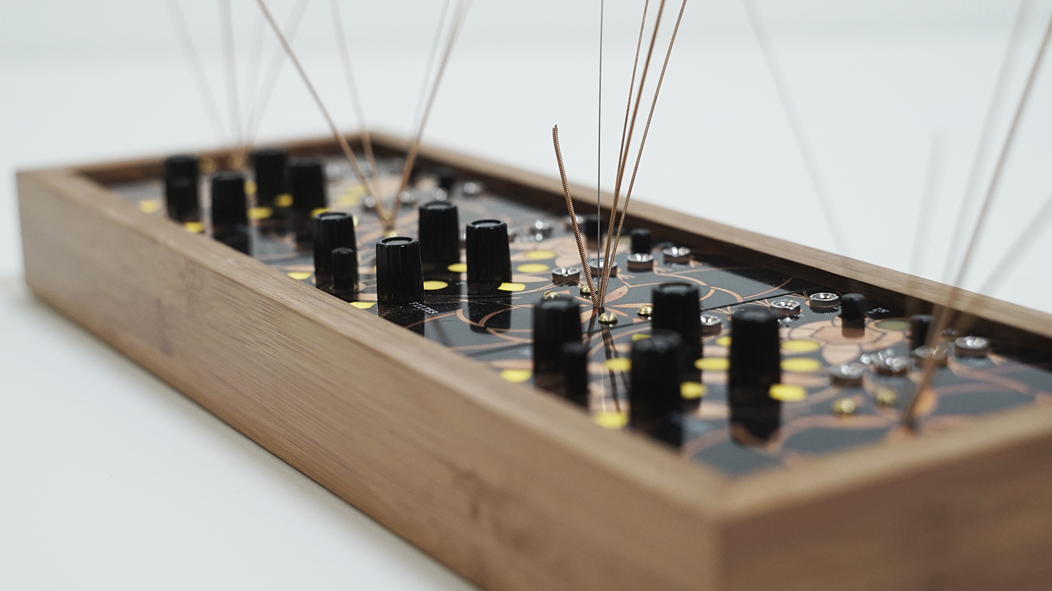 The garden essentially utilizes three Alter circuits but each equipped with a mic pre-amp, and 4 garden (stringed) panels for generating acoustics. By plucking, rubbing, tapping or even bowing, those micro-acoustic sounds become amplified and effected by the Alter in any number of ways. In essence, the garden is a large microphone designed to pick up vibrations.