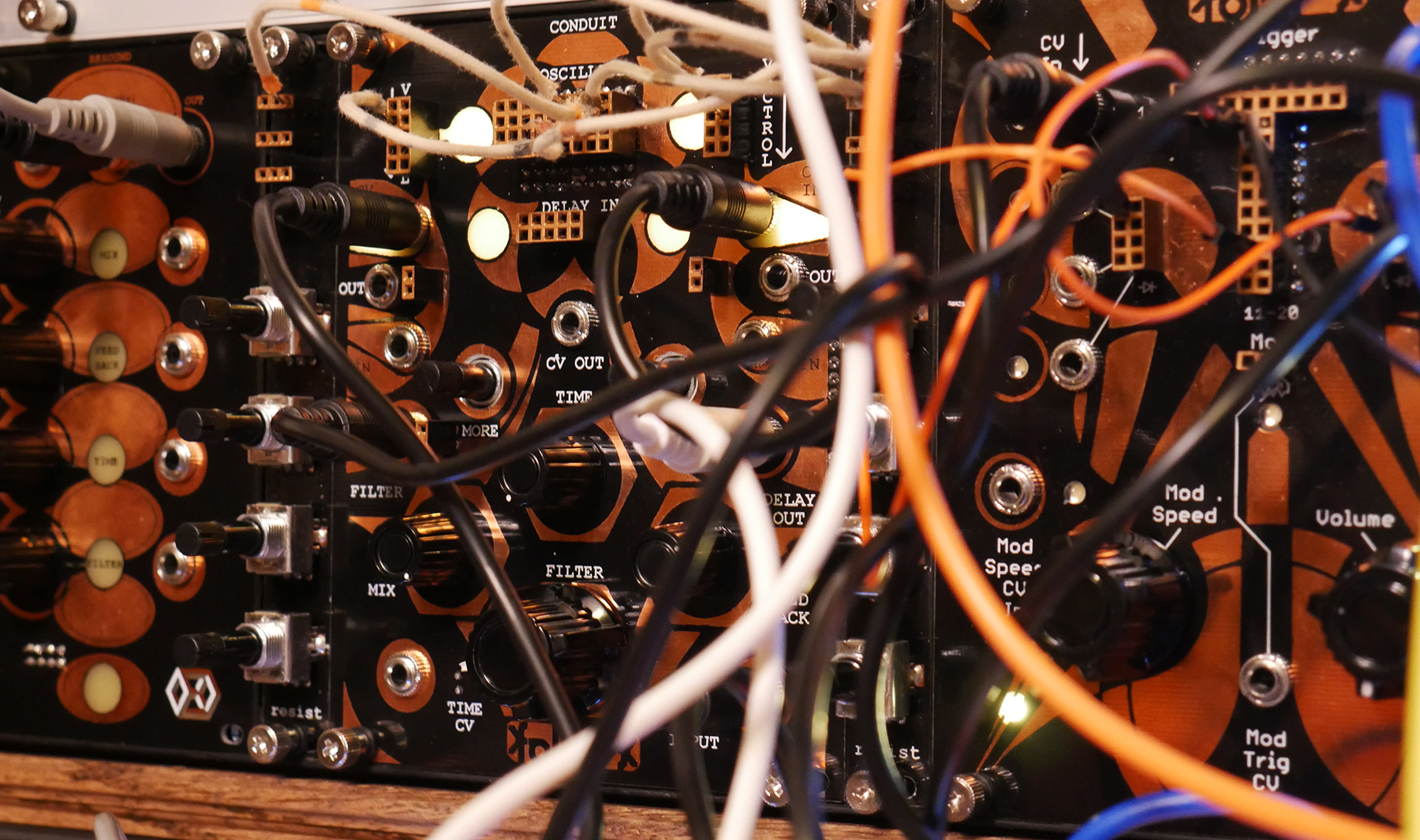 Conduit is a delay, filter, and 9 point harmonic oscillation module which creates three independent signal paths that can be inter-mixed how you like. It's also capable of jumping directly into the circuitry of Matter for processing. The root circuitry is based on the conduit desktop piece which is no longer in production.