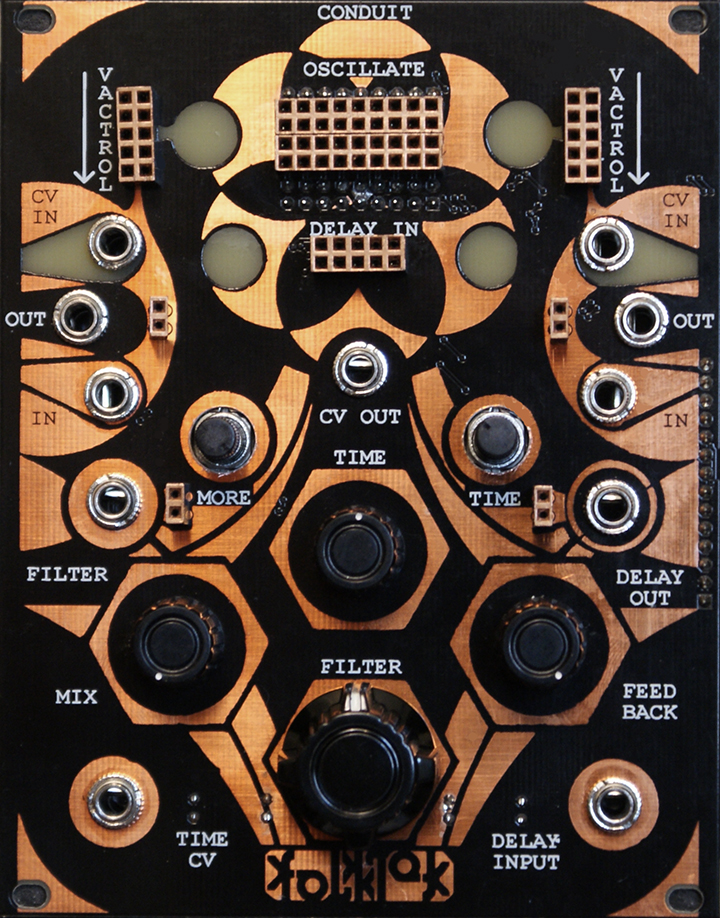 The purpose of this module is not simply as a delay or a filter - these are just components to a greater whole. With Conduit, aspects of the giant delay IC processing are accessed as a series of sound sources - harmonic oscillations based on the clocking of the delay. Therefore, delay time is the same as master pitch for these oscillations (also represented by "time cv"). There are a total of 8 harmonic oscillations and one noise source. All 9 points representing audio level harmonic oscillations are represented by a 9x4 female header so that each of these points or multiple points can be used as a sound source. Using Resist alongside allows one to control the level of the oscillation or mix multiple oscillations per vactrol.