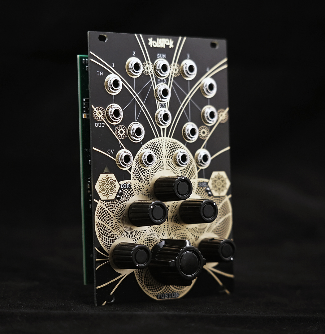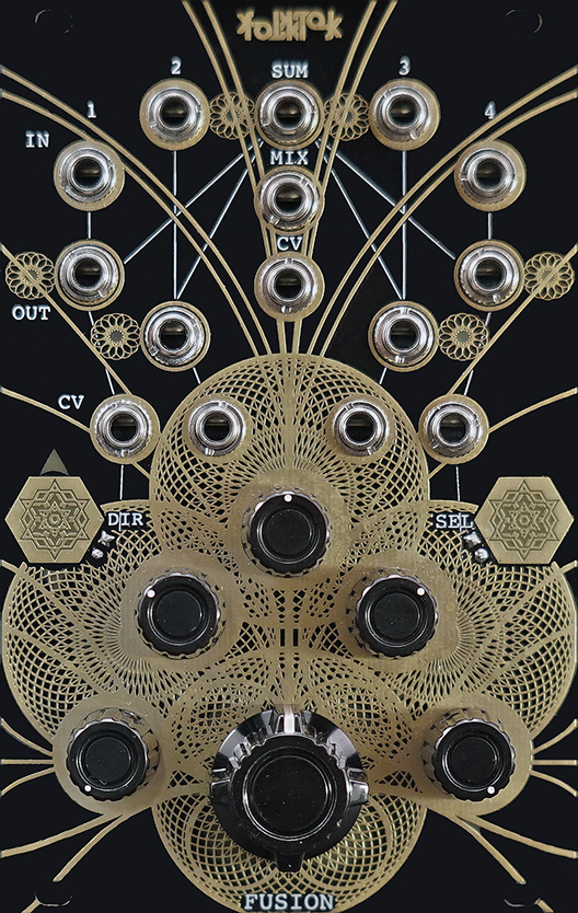 Fusion is a mixer that acts as any four channel VCA but it also allows one to seemlessly fade 2-4 audio signals on a single control and even do it with cv. Touch-based selector allows the selection of 2, 3 or 4 inputs to be fused with the fusion control and sent to a single "mix" output. Touch-based selector over direction determines whether the fader/ moves clockwise or counter-clockwise in accordance with an incoming voltage signal. Applying sequenced voltage to fusion allows one to jump between incoming signals - basically creating a triggerable 4 track.