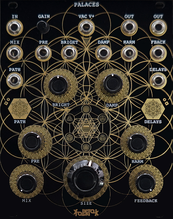 Palaces is a reverb and delay module which utilizes seven pt2399 delays. It includes bright and damp controls to create reverberation with feedback and size control to act more as a spring or a giant plate with stereo output. Switching the path sends all delays into a different configuration which changes the character to create a more straightforward delay system or a complex weaving of interconnected and offset metapatterns or chaos as the selectable number of delays 1-6 are added to the output. The delays feed into each other at different points of the feedback path so the signal can become very dense.