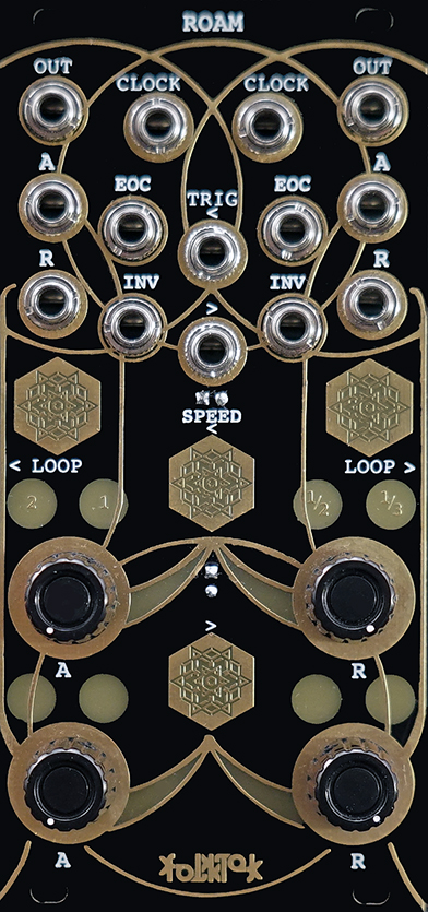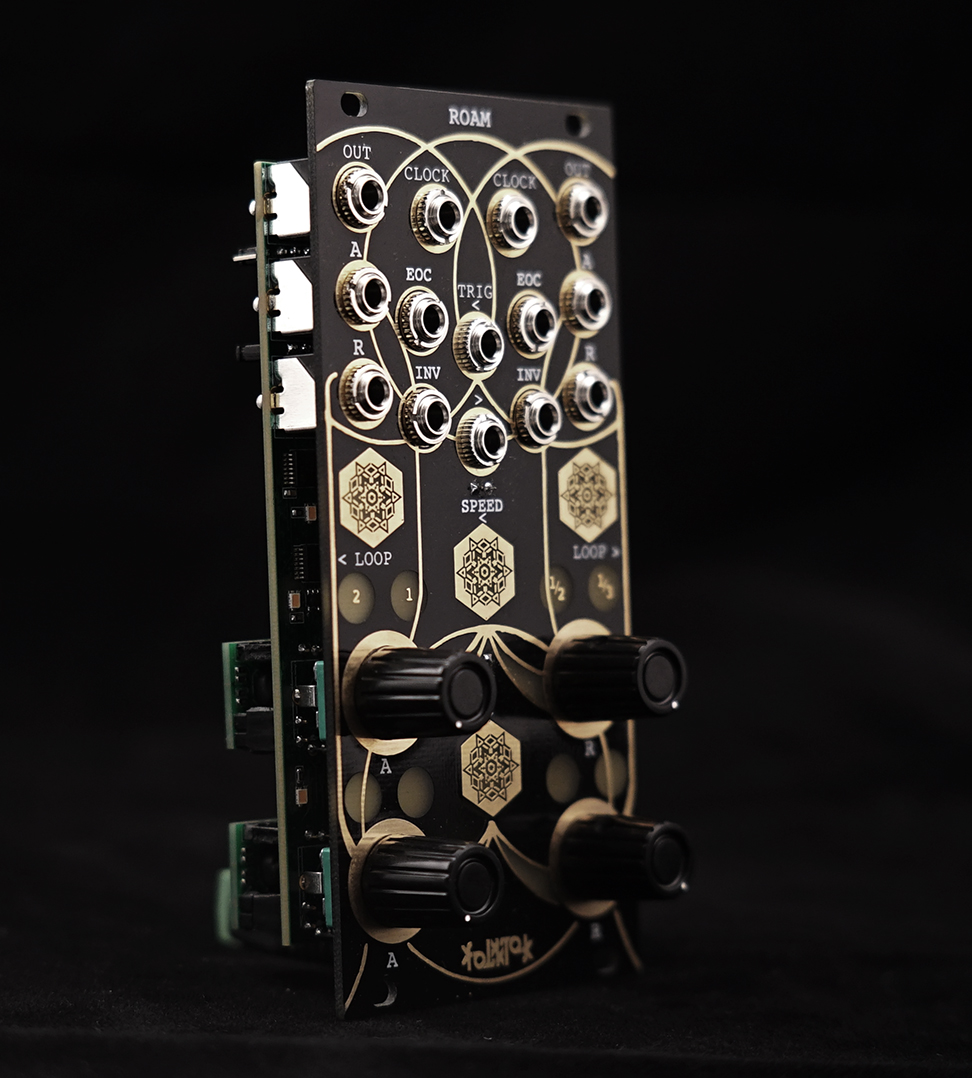 What makes this module unique: triggerable a/r is not new but as far as we know there are no modules (including Maths) that allow you to trigger at any point in the cycle. Roam will trigger on the rise as well and not just the fall of the cycle. Additionally by adding our clock multiplication/division, if one sends audio to the envelope, the envelope will be synched to the audio oscillator for added musicality.