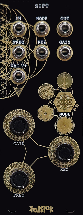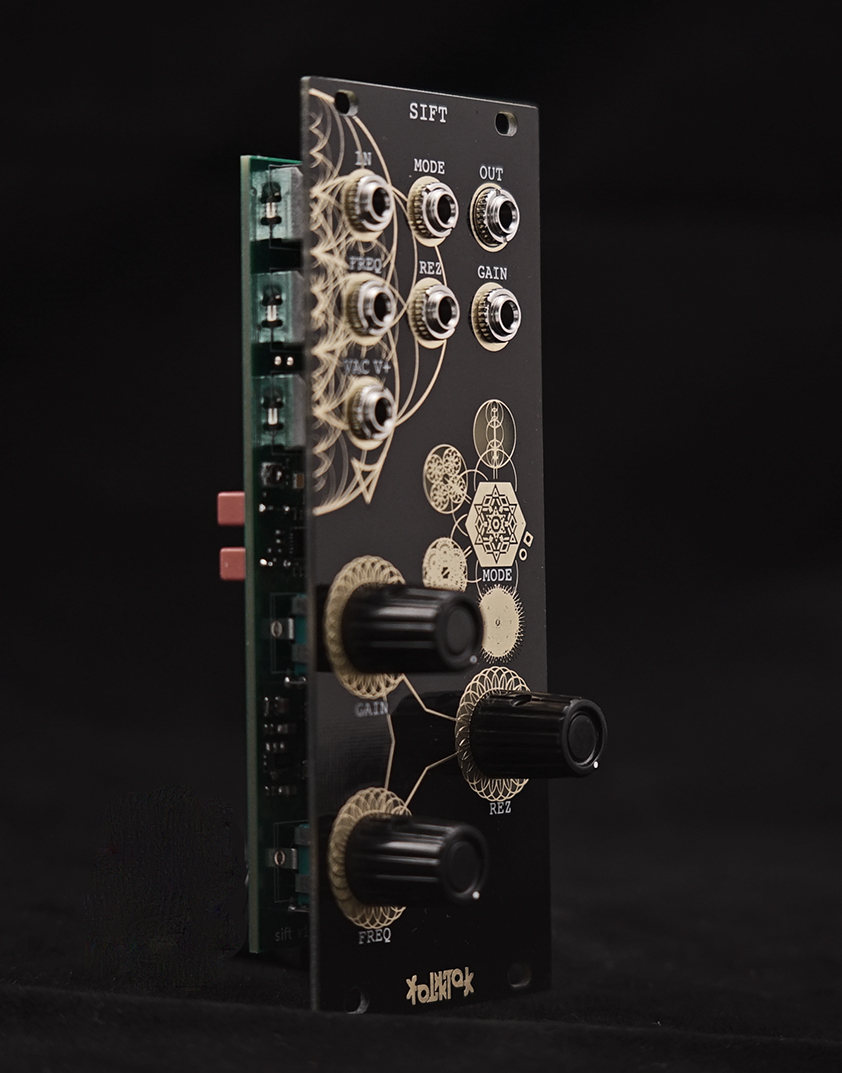 Sift is a multi-mode low pass filter. There are five modes selectable with touch-based switching which change the character - normal, noise cv integration on the cutoff, square wave replication at the input, extreme resonance overdrive and all modes combined. The gain control hits 100% at 12 o'clock and beyond that will completely crush an incoming signal while maintaining a balanced output level to turn the filter into a distortion.