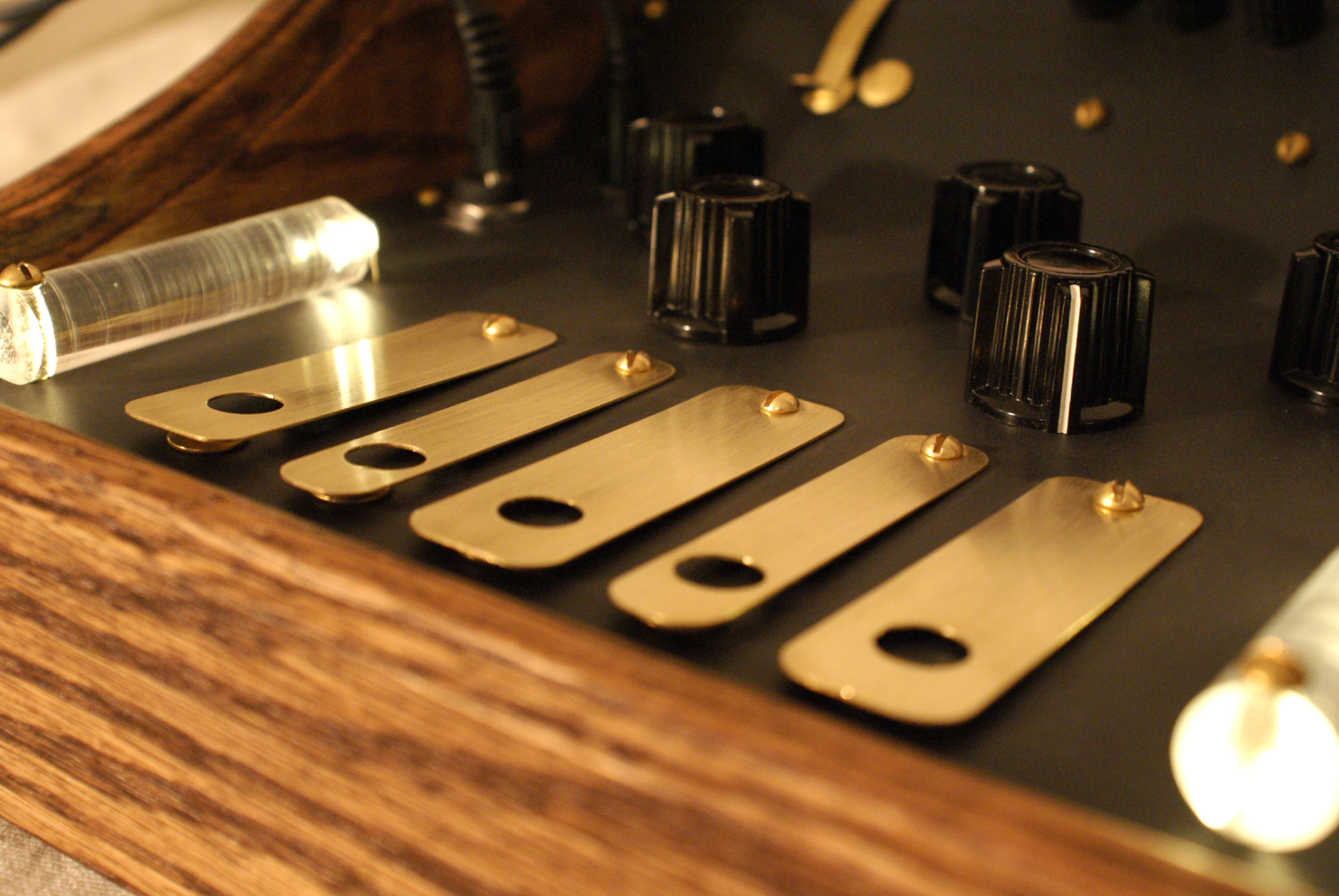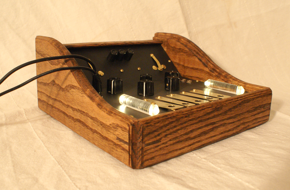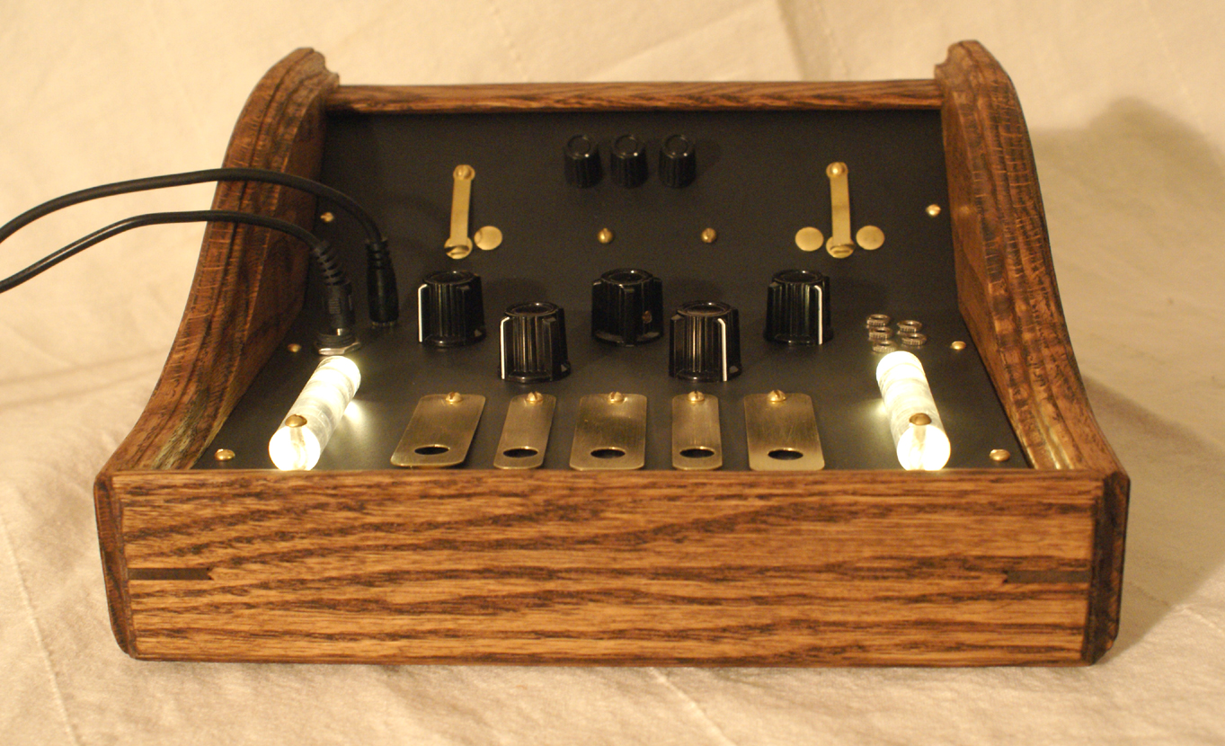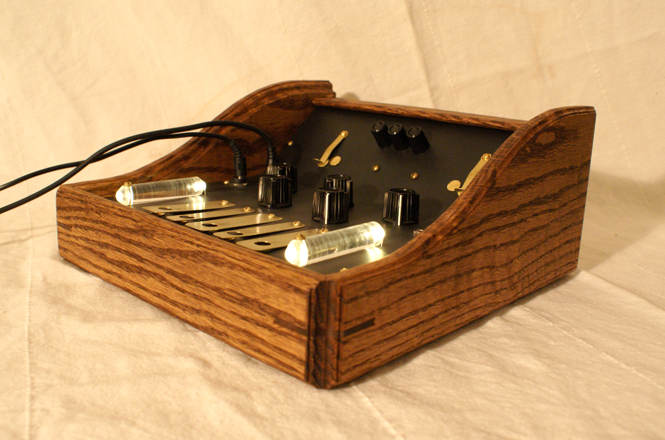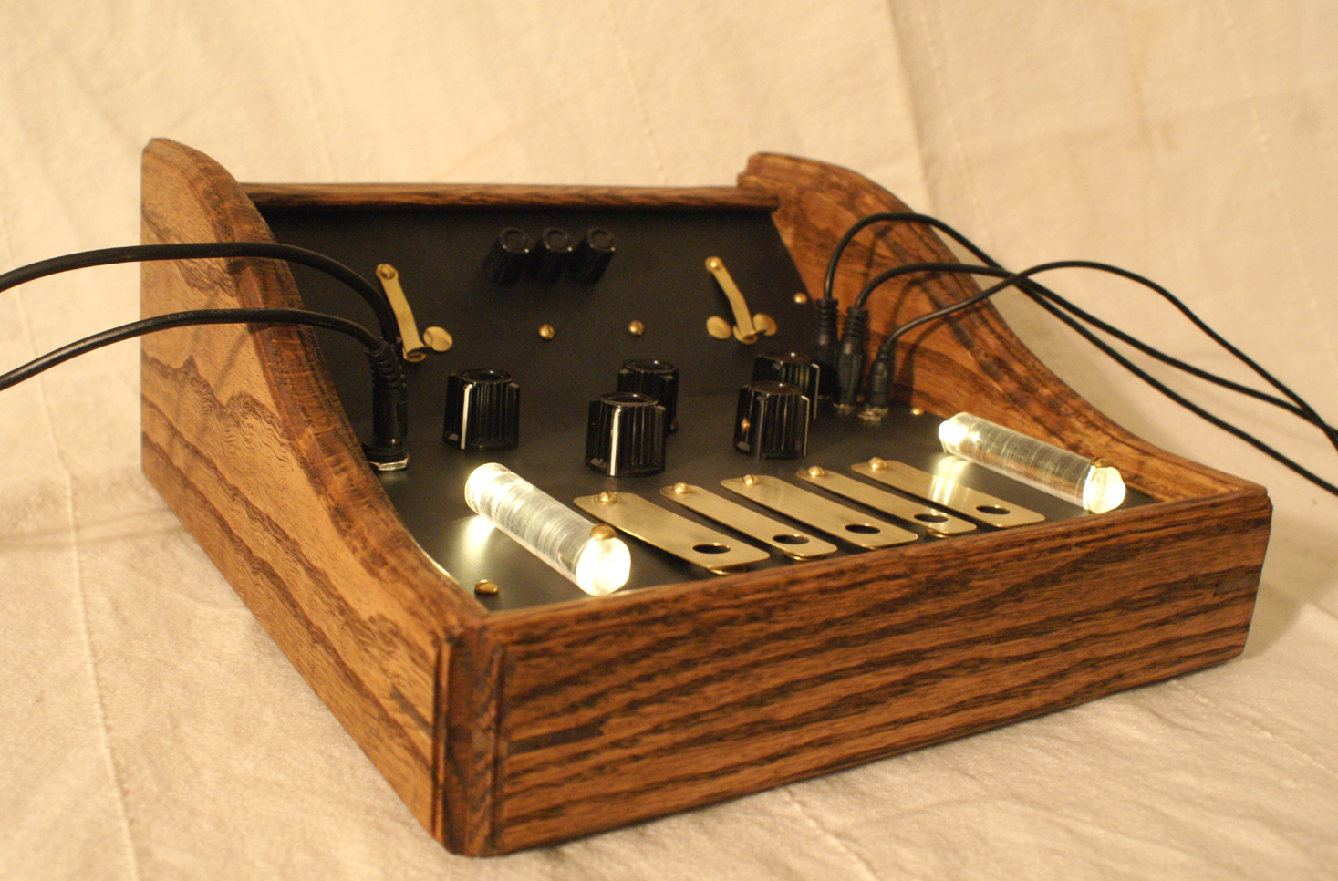 The boxes are oak, 1/8" output jack, 5x 1/8" cv jacks, control over delay time (from extremely notated tight to about 1.5 seconds with near infinite repeat for loops), control over each of the oscillators with custom brass keys for each, 2 custom lamps glow warm white, custom switches for delay time and drum mode (3 modes).