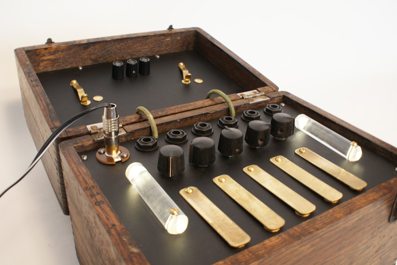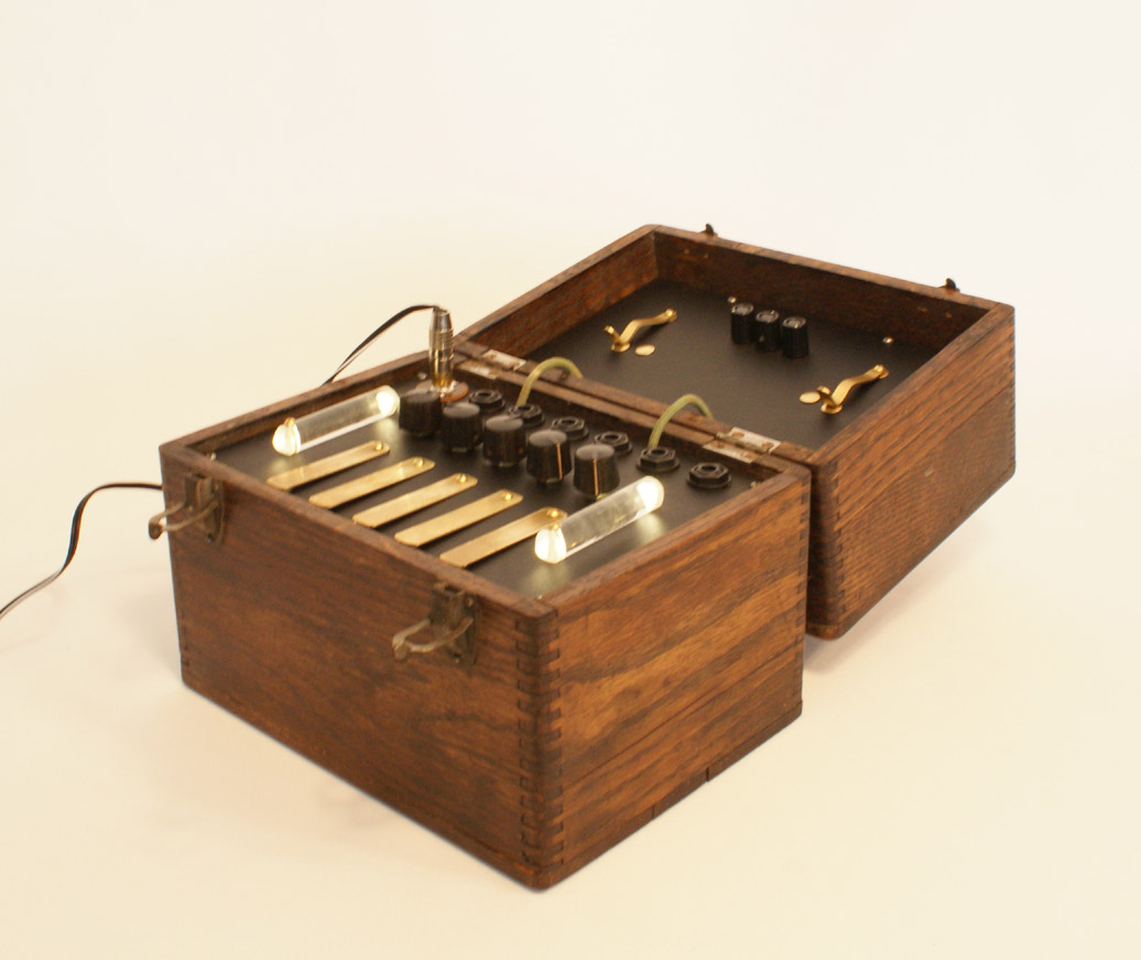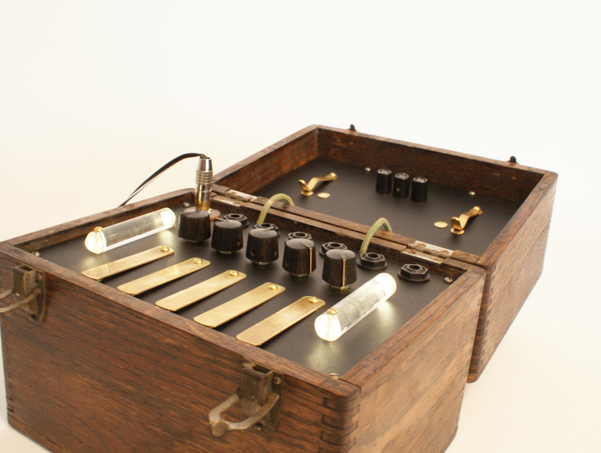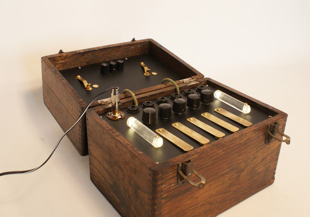 Another of the Drum Scape series built into an antique box. For video, sound examples, and more details, see the drum scape overview page. Currently built on co-mission only.