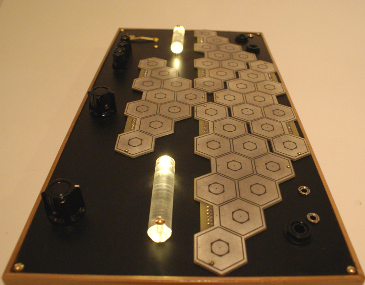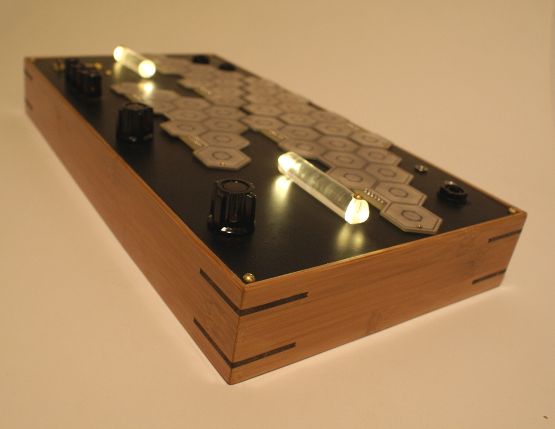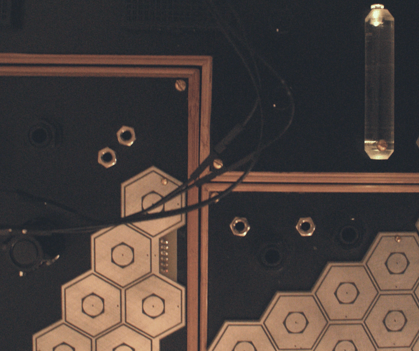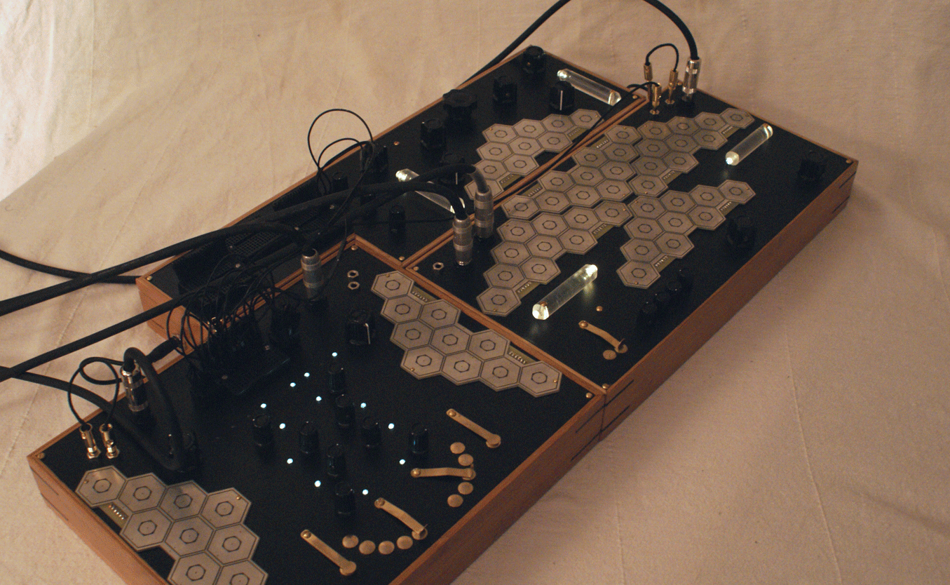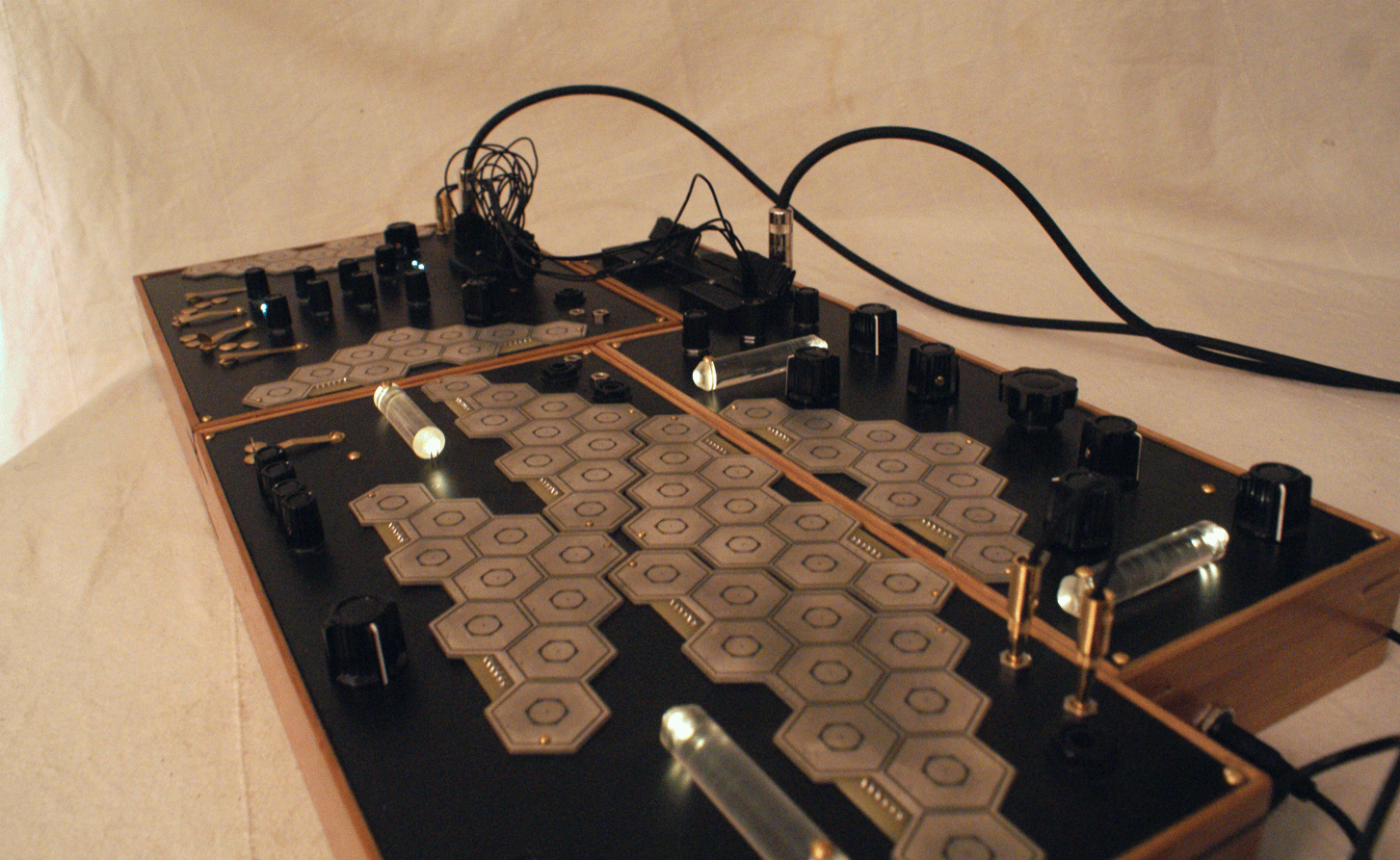 Two touch panels contain 10 responsive "keys" each that represent the primary low oscillators and higher decay oscillators. When the global pitch is dropped, the low oscillators go into a synchronized LFO mode where each key represents a different time signature. The decay section is made to have a natural decay where attack and sustain are controlled by touch. Another panel integrates a more subtle set of oscillators that replicate the decay panel and are made to influence the other oscillators. Finally, the amp section alters the sound of the low oscillators and provides everything from deep, filtering swells to subtle pitch change.