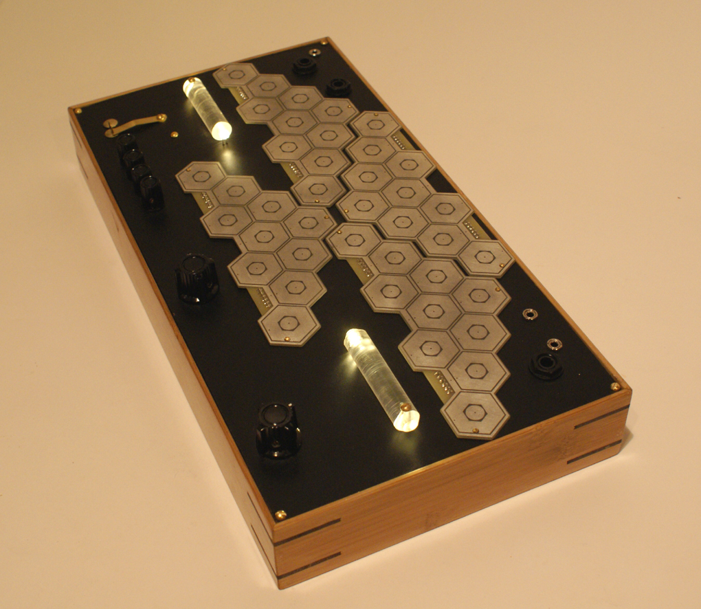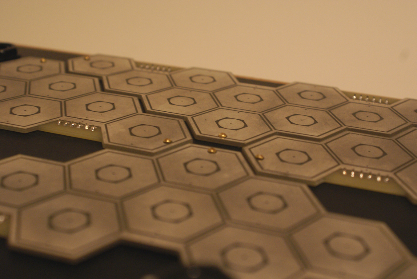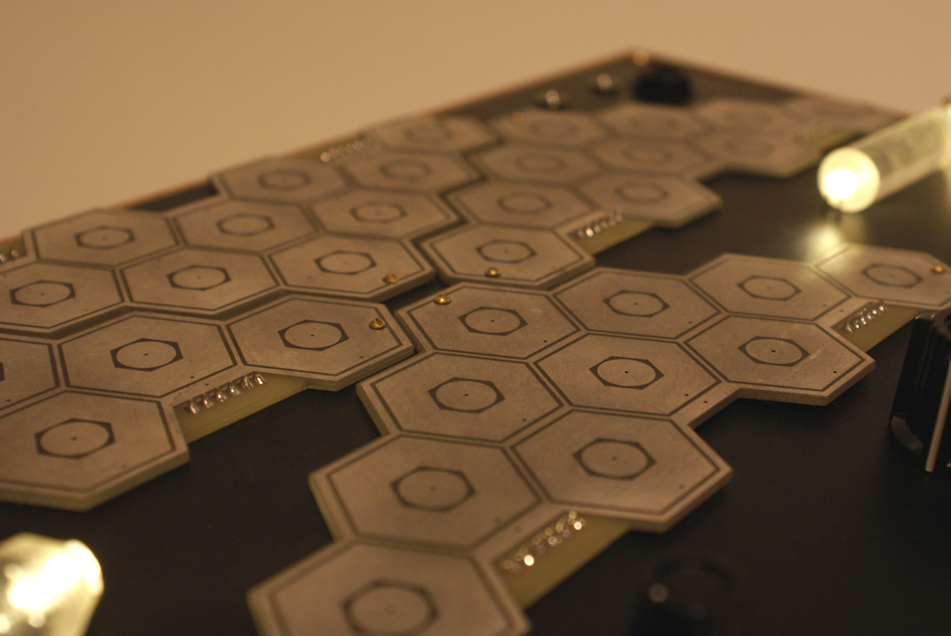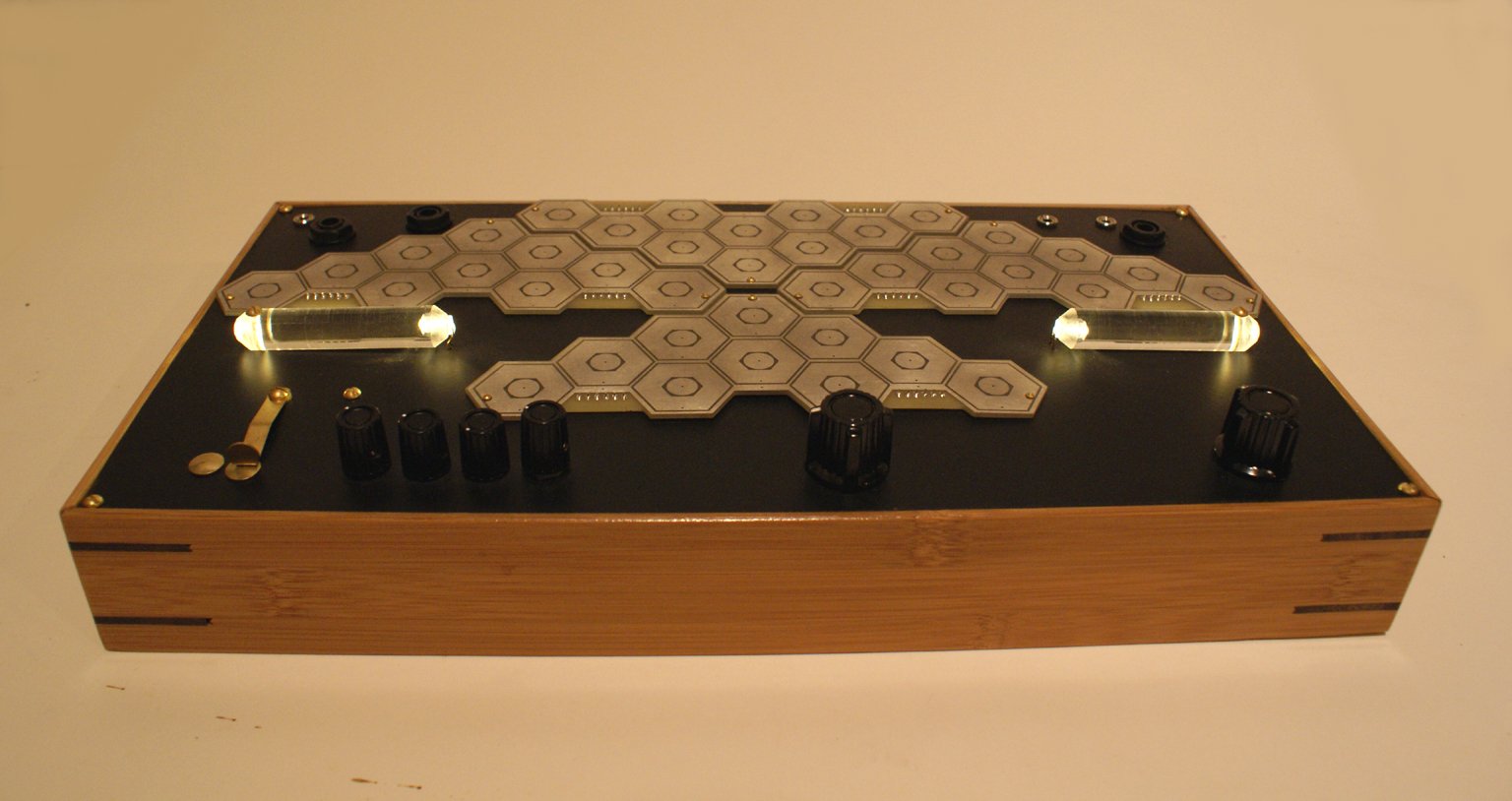 Two touch panels contain 10 responsive "keys" each that represent the primary low oscillators and higher decay oscillators. When the global pitch is dropped, the low oscillators go into a synchronized LFO mode where each key represents a different time signature. The decay section is made to have a natural decay where attack and sustain are controlled by touch. Another panel integrates a more subtle set of oscillators that replicate the decay panel and are made to influence the other oscillators. Finally, the amp section alters the sound of the low oscillators and provides everything from deep, filtering swells to subtle pitch change.