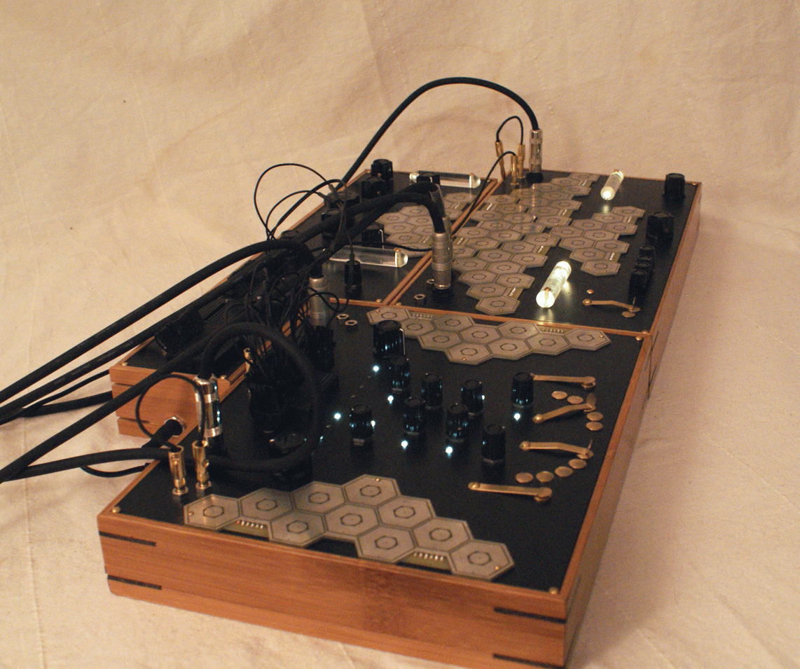 Aether is a touch based work with a very sweet and rich sound similar to that of the Euphonos Field (though not as broad). It features 10x2 oscillators and an equal polyphony, is capable of connecting with anything that accepts control voltage and also has a set of touch "keys" that transmit CV.