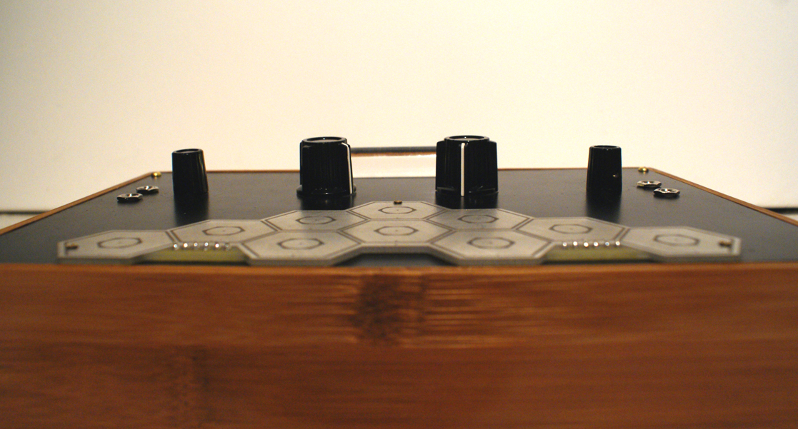 - touch pads; 8 polyphonic notes + noise + pitch: all sensitive to touch. These are synchronous with the delay, meaning delay time = oscillator pitch. All notes are tuned with one another so the pitch is a master control.