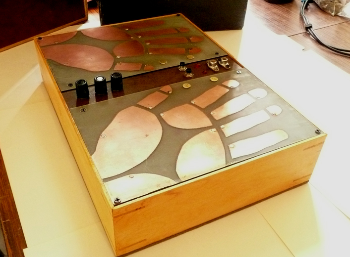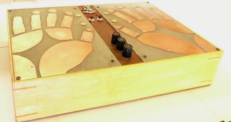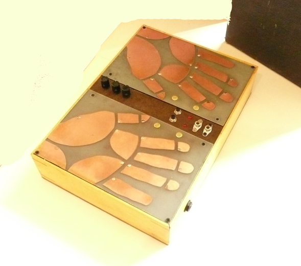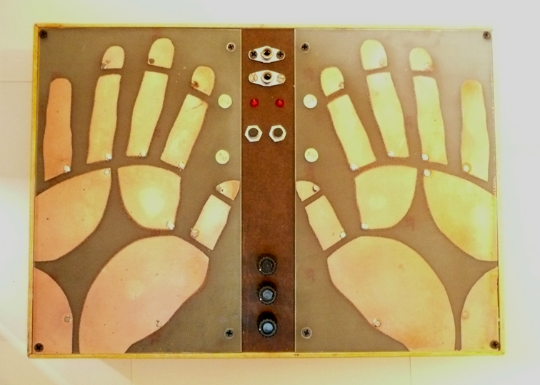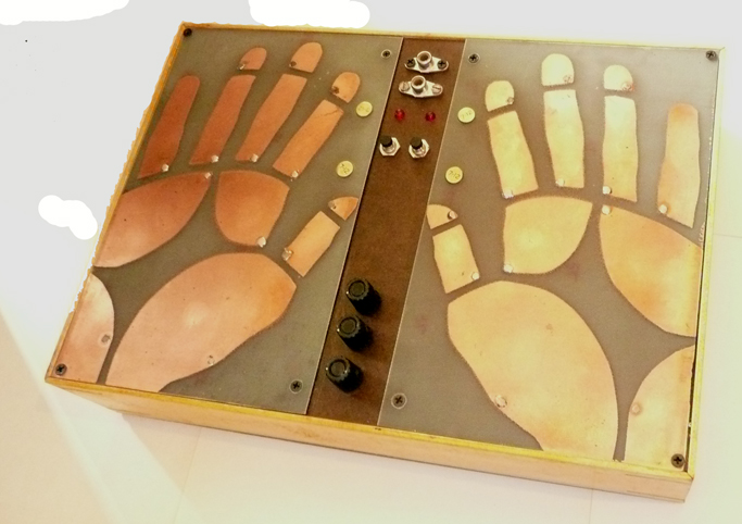 This piece was created in consideration of sci-fi sonic palm reading , future/past pychic machinery, antique quack technology and the beauty and grace of the human hand. The hands and finger tips are extremely tactile and sensitive. The Electric Hands works to explore the arena of touch based sensual body to electronics and electricity. In this piece a touch based field of copper pads is utilized to create a noise/drone synthisizer, built to be played intuatively. Based on duel ossillators feeding into each other, this piece provides a distinct pallate of sound. Each copper pad is reactive with each other using the hands as a conductor. Soft touches produce soft sounds and pressing the hands down will create hard/loud sounds. Subtle wave transformations can be constructed and subtly morphed or harshly destroyed. Often intermodulation occurs between the circuits for a very rich sound. Other controls include a frequency knob that takes the sound from fissing high to a throbbing low, volume knob and Gain. Unit has a 1/4 inch out. Includes manuel Runs on two 9volt batteries