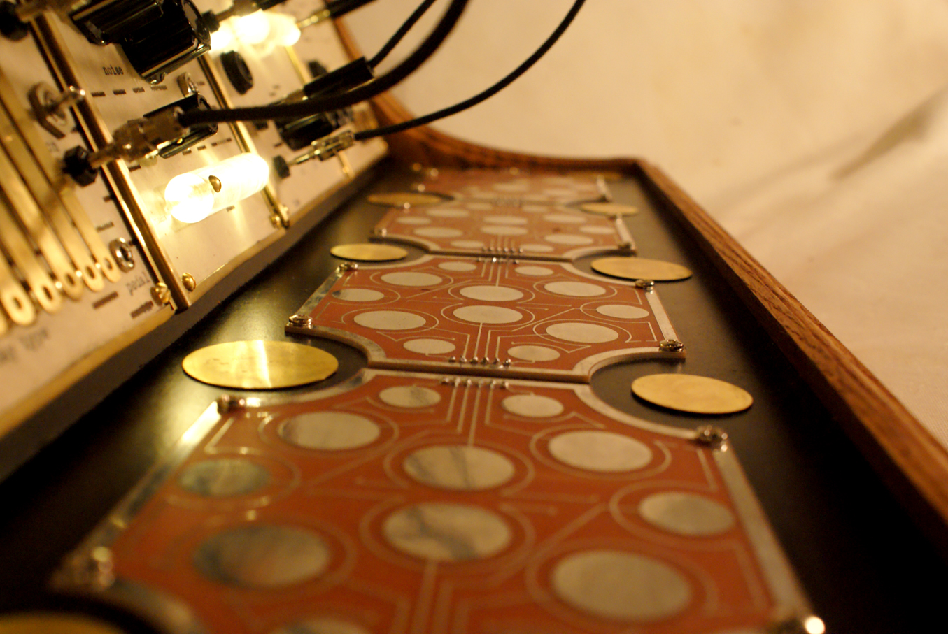 The Euphonos Field features polyphonic (no limit) touch based synthesis, synth trigger section, thick reverberation, filteration, delay and looping and two sequencers. All patching can be done on board with included patch cables and all modules have 1/4" ins and outs to send to/from external gear. The sound patching can be arranged however the player likes. ie; synthesis > reverb >delay/loop >filter. Each panel has Control Voltage to be accepted from the sequencers or from any external CV covering the synth pitch, synth triggering, filter frequency, on/off of reverb or delay, delay time and loop capture. Loops can be captured in time with the sequencers (which can be synchronized to eachother optionally or synched to external clocks) and both the delay and reverb decay when turned off.