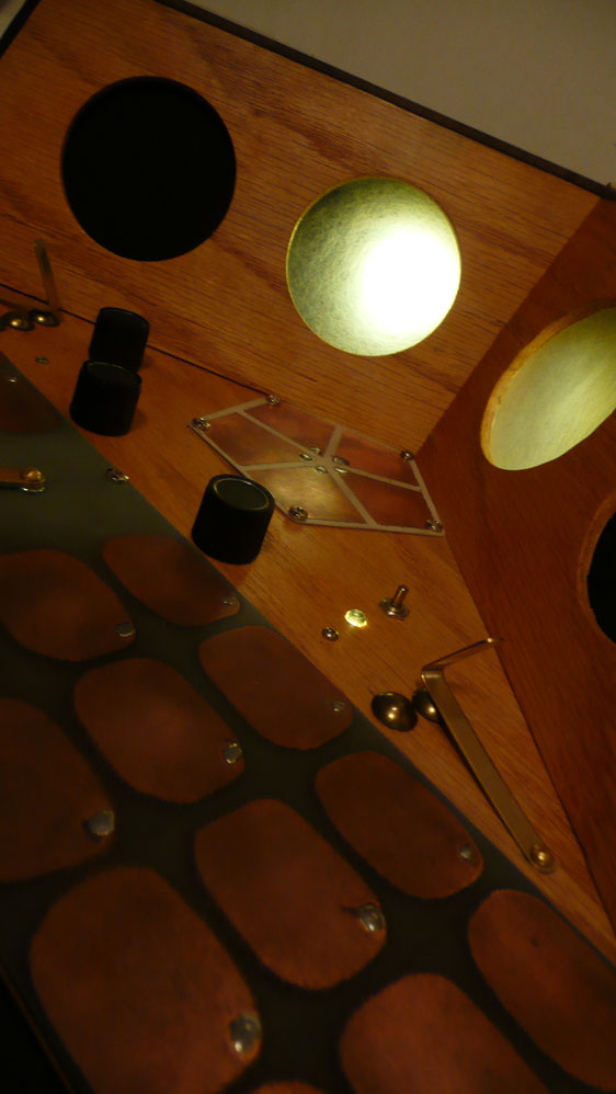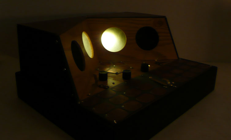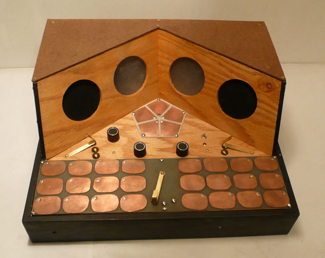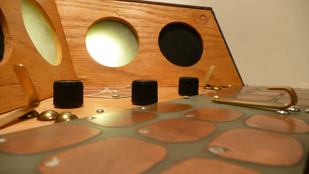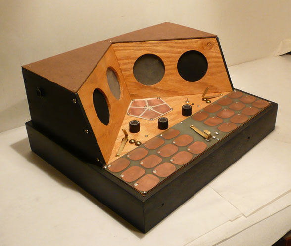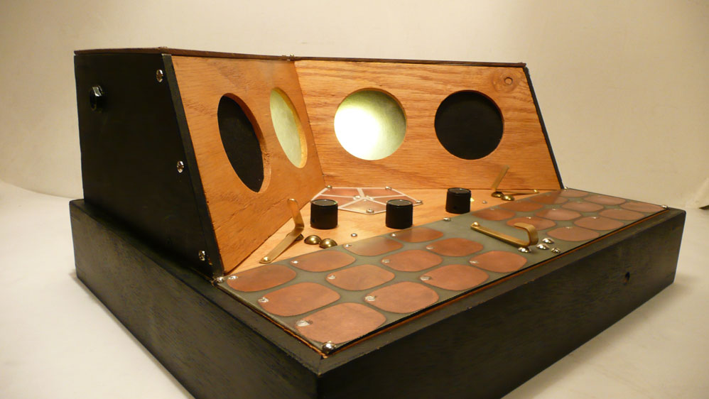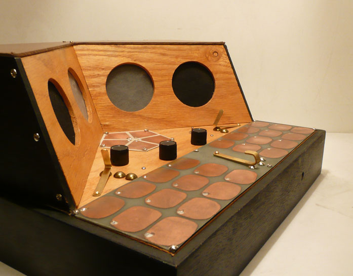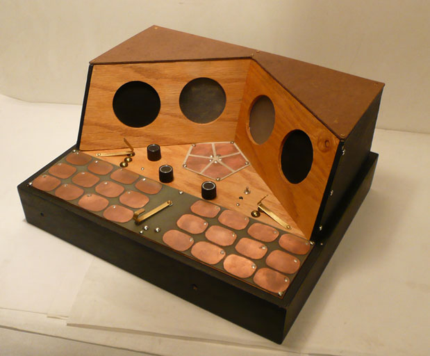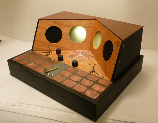 The Feed Scape is a polyphonic touch based synthesizer which relies almost exclusively on feedback. The feedback, therefore, determines the range of decay which can result in straight synth tones or in longer decay mode, can result in exteremely odd modulation that is ever changing. The "keys" can be played to determine the attack and sustain in conjunction with any of the five primary touch points. There are several modes to allow for various effects over the oscillators which are highly unusual, anything from underwater tonality to odd modulation and LFO. The noise section is outstanding and can be used to provide subtle bursts, backdrop texture or all out insanity. This work creates a vast field of variations on noise and can be mixed with any of te primary notes to expand on the initial depth of pressing one noise key. There are two time modes, from very tight to about two seconds of decay. The latter allowingto actually create verses which repeat into a decaying and ever-changing eternity. there are additionally controls for effect mode light or hard and level. The internal amp has an on/off switch and the piece runs on a 9v battery so t is fully portable. Also has 1/4" output and onboard lighting. A very unusual piece, perfect for textural synthesis and NOISE. one of one.