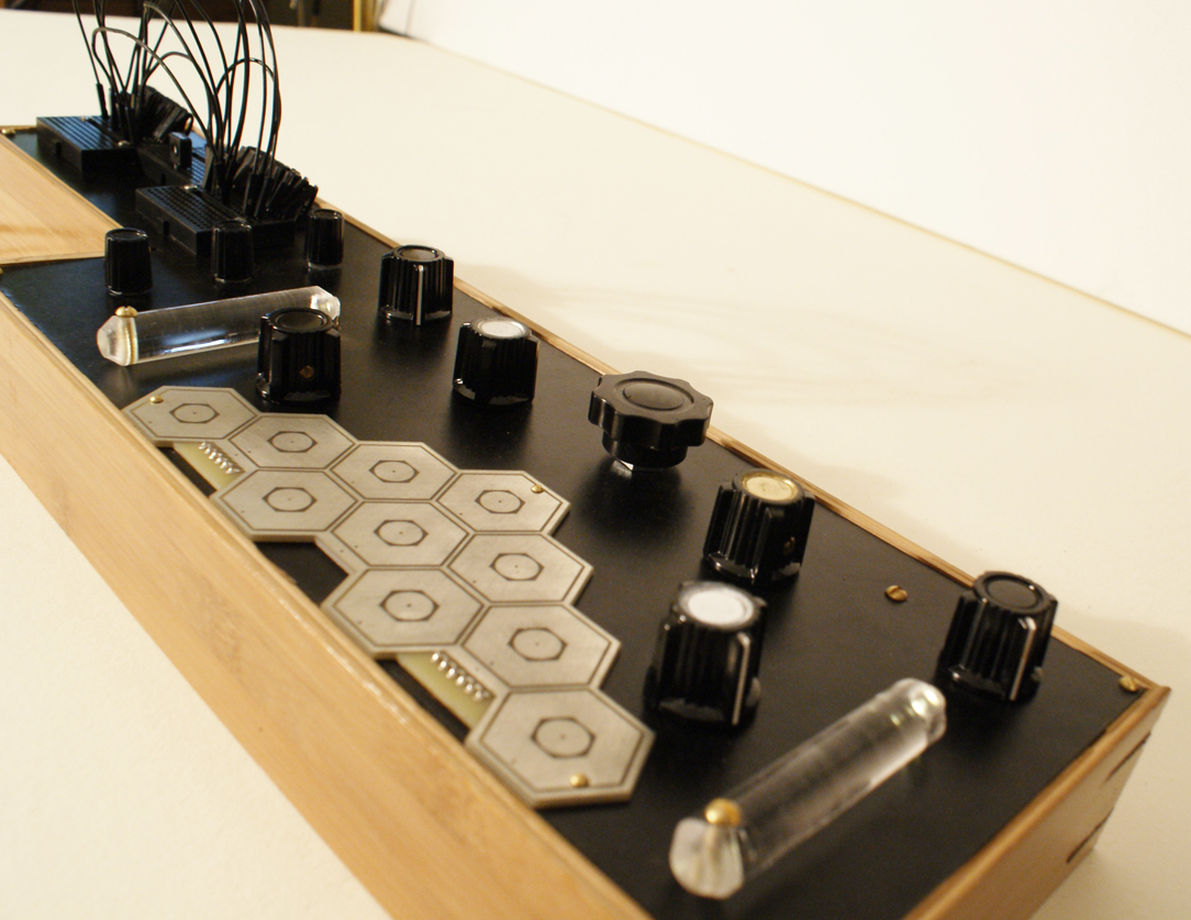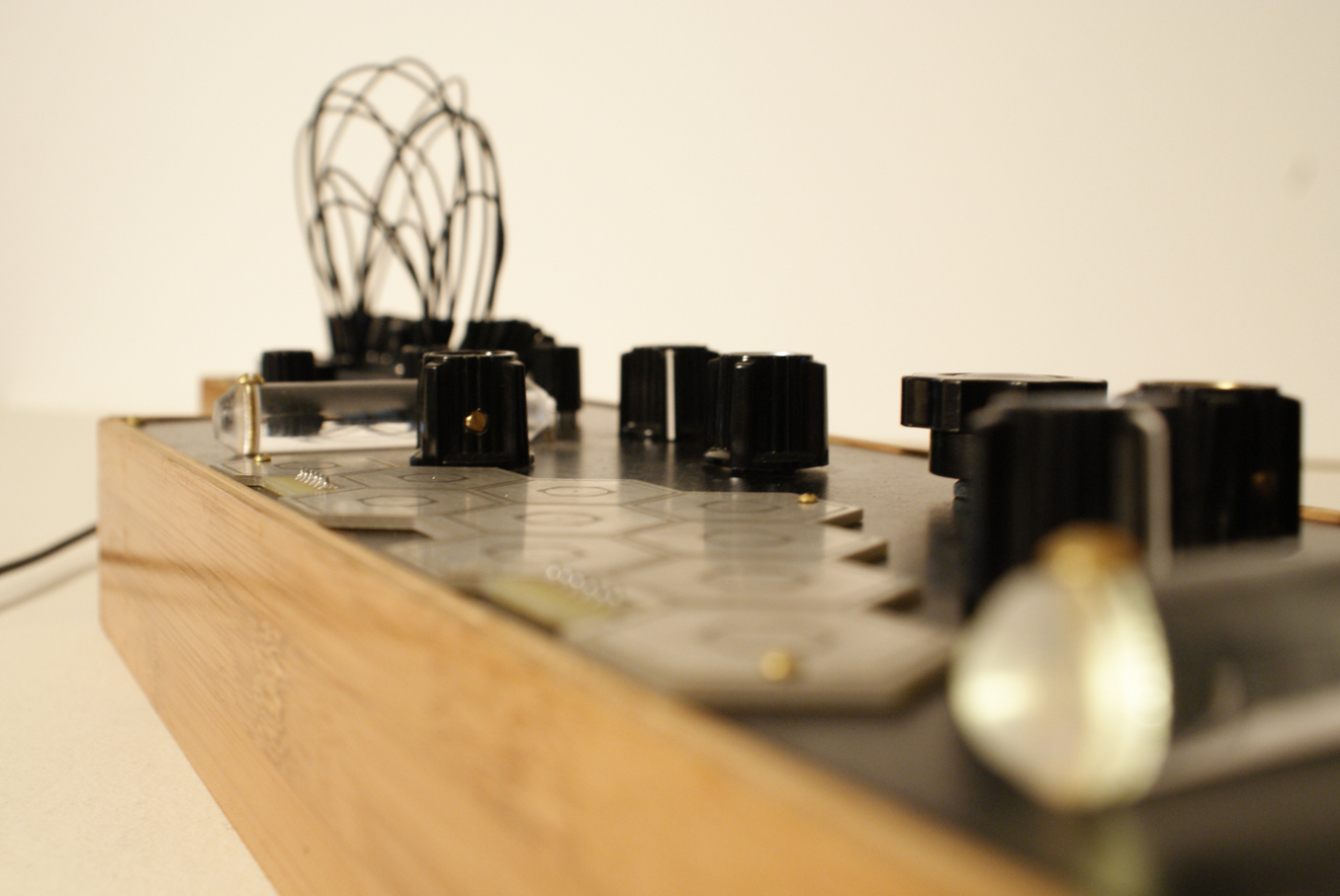 - The left patchbay is routed to the internal synthesis and has 17 points to connect however the player likes, adding any photocells, trim potentiometers, resistors, etc one likes to make for more possibility (though it's not necessary). Patching can be done directly to generate sound but it's nice to also patch to...