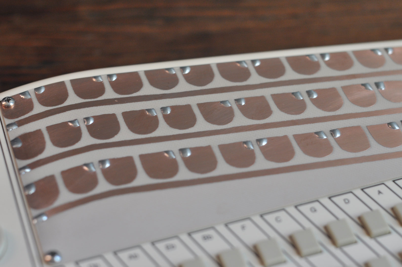 The hand etched copper clad section on top features 3 rows of twelve notes including ,mid,bass and grimey tones. The Bottom copper clad section features 12 sonorous chord tones as well as 10 amp points that in combination with any note section creates distortion, warble, noise, grime, noise and leval/bass boost.