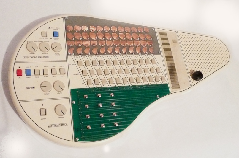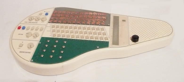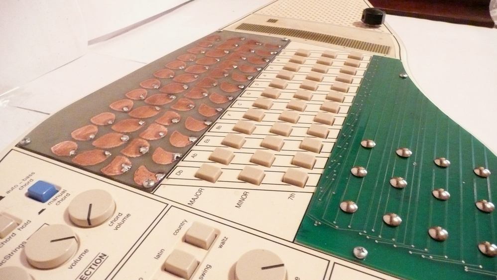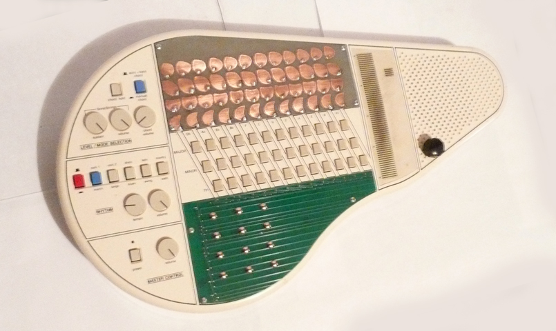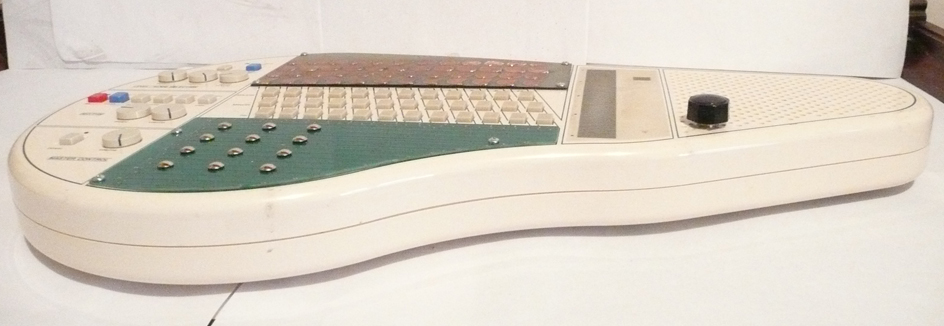 Here is one of the first Modified omnichord system(om-36). This piece features 60 touch points allowing you to produce rich and complex tones and filtering and distortion. Multiple tones/notes can be played at one time to create thick and complex tonal harmonies. The hand etched copper clad section on top features 4 rows of twelve notes including high,mid,bass and chord tones. The 12 mains on the green bottom section allow for various distortion, warble, noise, grime, pitch and leval boost. Omnichord functions regularly when no touch points are activated. Also features a pitch knob.