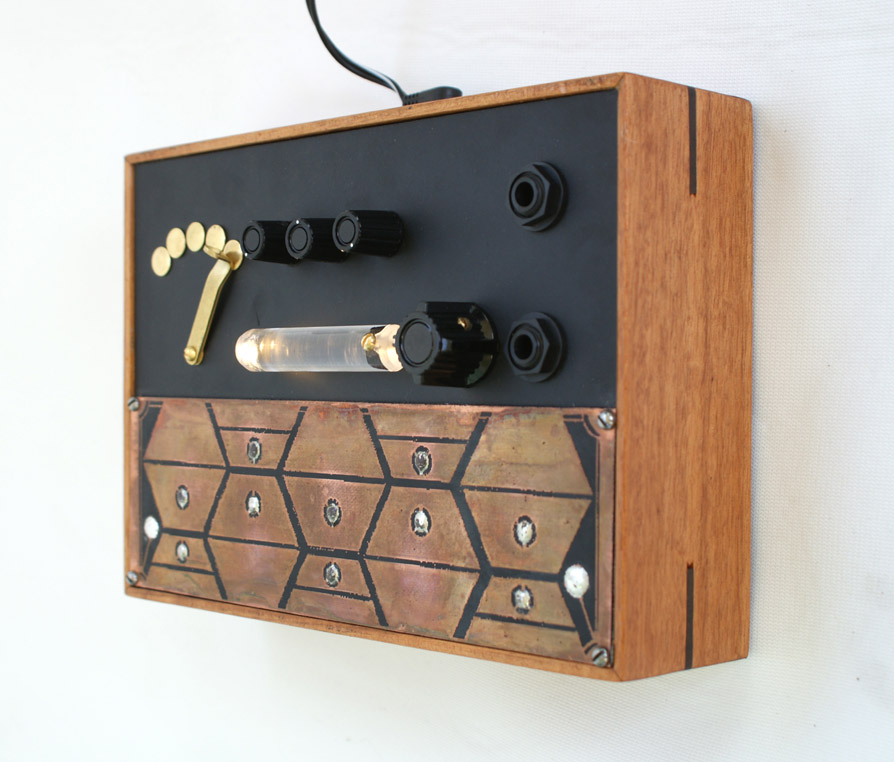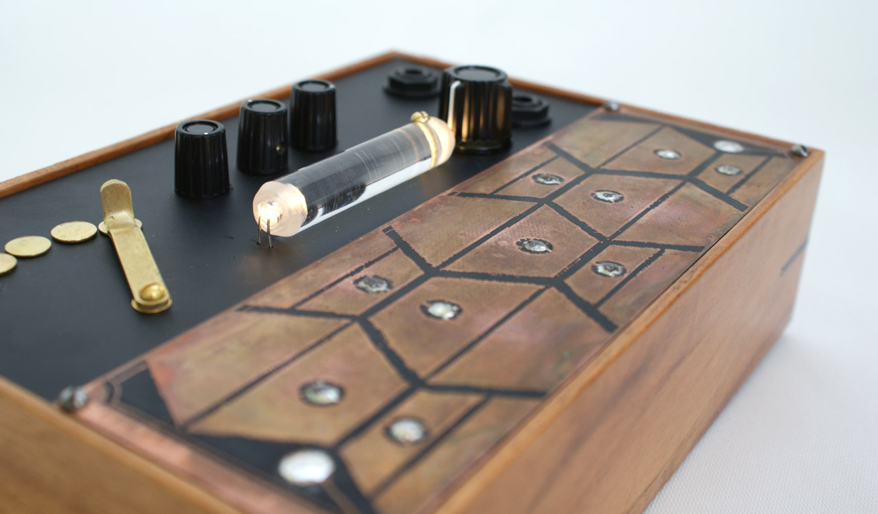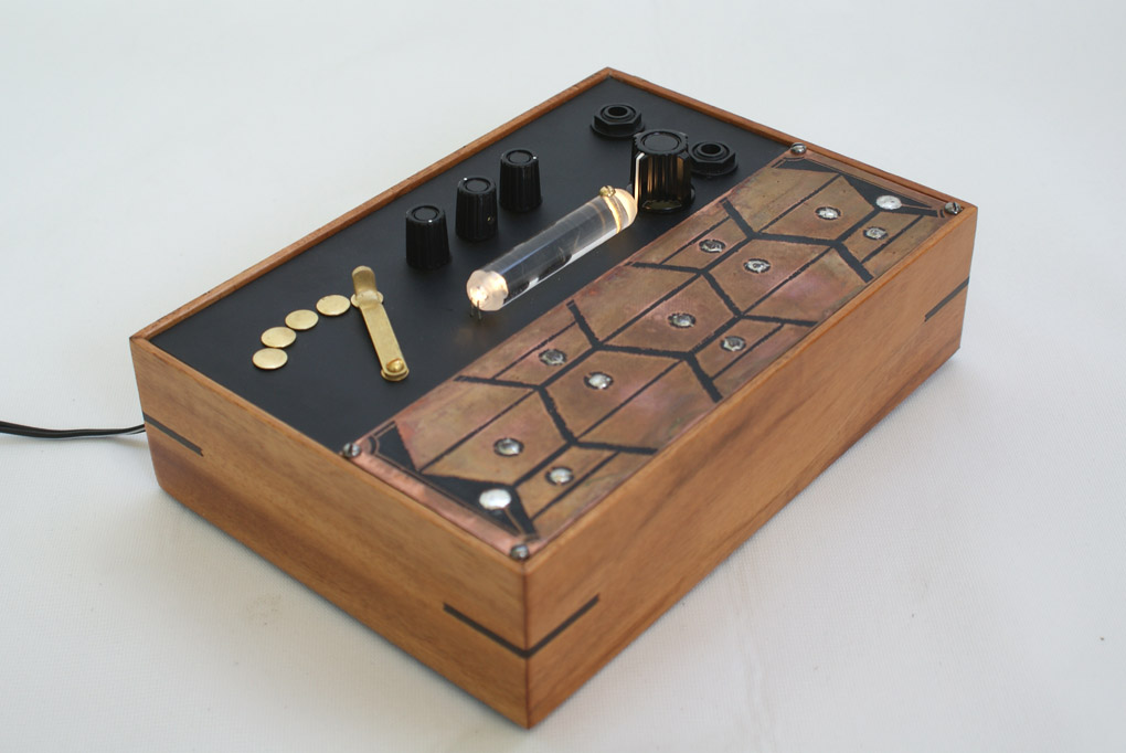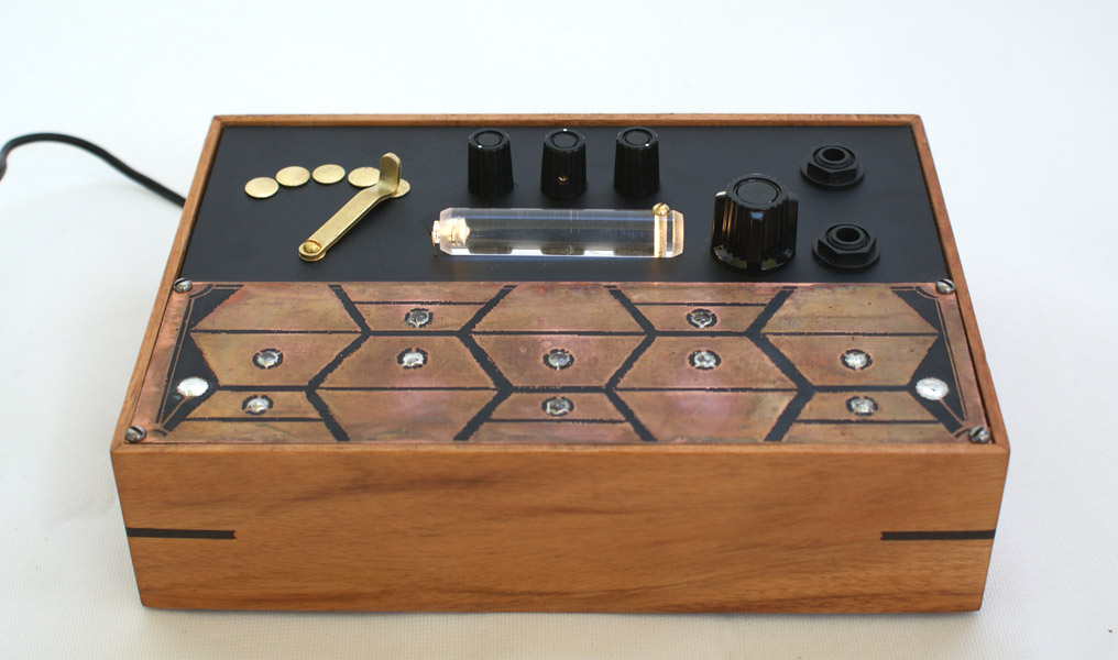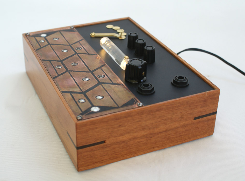 The Synergist is a touch synth built into a custom hardwood box with an intentionally aged touchplate. Designed with 8 osc. and an 8 note polyphony and noise and time points - each osc. is tuned in correspondence to one another to create a full body of notes. The oscillators tie into a delay, the timing of which controls the global pitch of the oscillation (when the time on the delay is lowered or raised, the frequency of all 8 oscillators are lowered or raised accordingly). Thge delay ranges from extremely tight to a longer approx. 2 seconds (getting gradualy dirty and grimier toward the lower end)