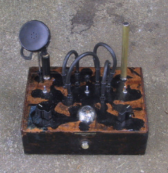 One of those early telecom works...Many of these were made in the early 2000's - a production series of maybe 20 - everyone was pleased...More customized versions of these were also made. many photos of older works were lost. This one was done up nasty...A lot of ink and resin. The speaker was from an old set of headphones and made to be optionally mounted on the box. The Mic was cut from a tube of metal and had a jack mounted on one side so it jacked directly in to the board...
