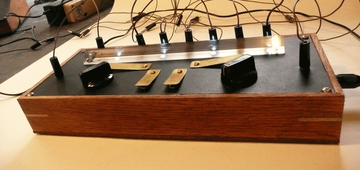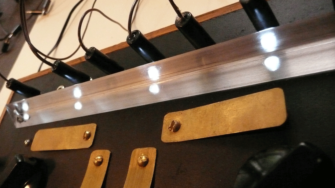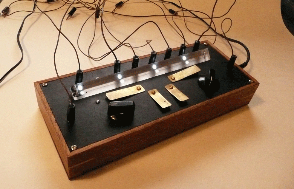 In addition, parts can be added with the "add step" button, so intead of having one part proceed step by step, any number of parts can be addedcreating a matrix effects and connecting multiple points at once and in succesion. Parts can then be subtracted as desired using the "subtract step" button. Furthermore, all parts can be erased at once or the step can be paused with the push of a button. There is a time knob and a swing knob to control timing variation. The lamp section is custom, the low profile and small hardwood box is custom and all of the buttons are handmade.