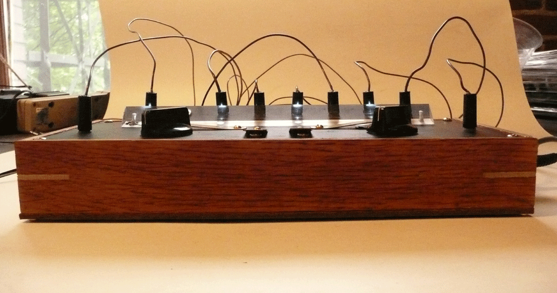 The Scape Sequencer created by Arius Blaze, was originally designed as an accompaniment to the time machine or any of its close cousins, ie. the Time Scape, however, it is made to work with any piece of gear that has a point to point patchbay including any of the patchable folktek works. It gives entirely new dimension to everything we've tried it out with. Playability is simple - there are two "mains" to control respectively, parts 1-4 and parts 5-8 of the whole 8 part step sequencing - these are patched to any points on the main patchbay, then parts 1-8, any or all of them, are patched to alternate points on the patchbay making switches as the step proceeds.