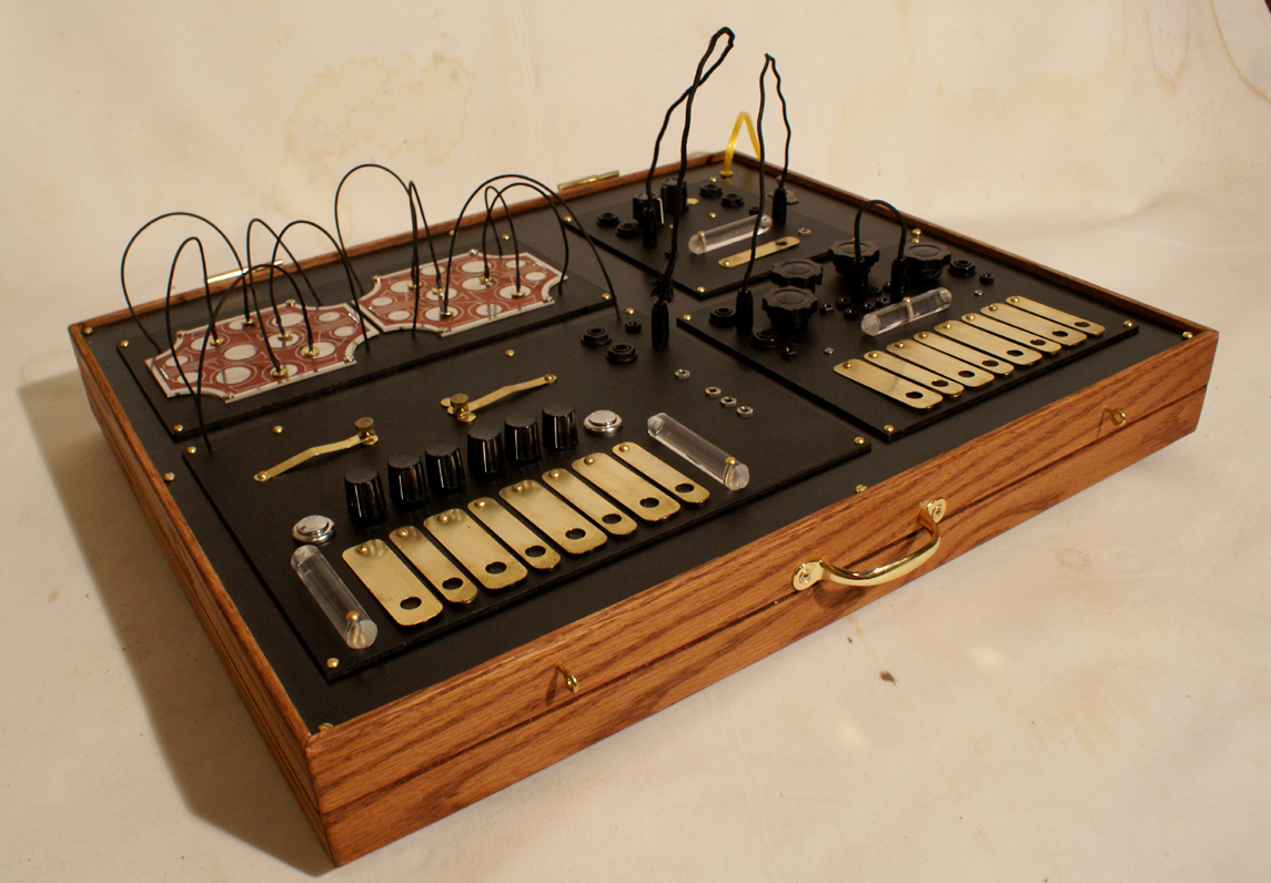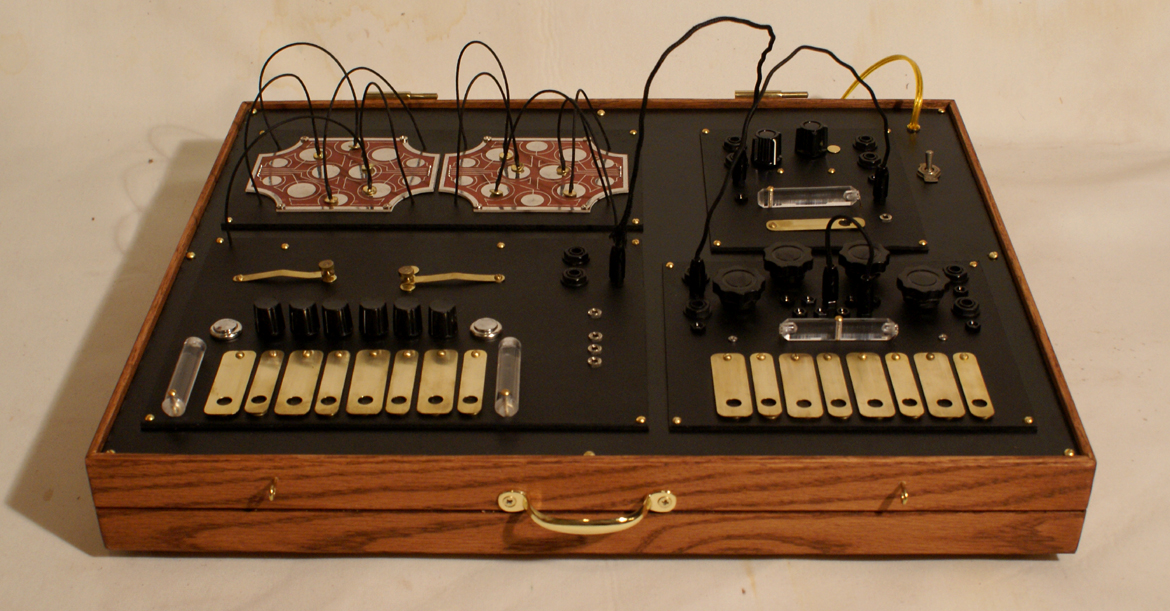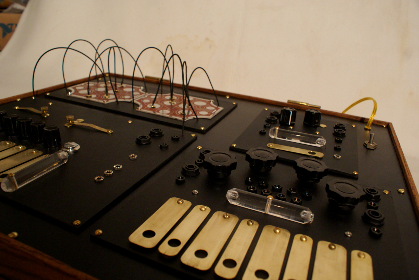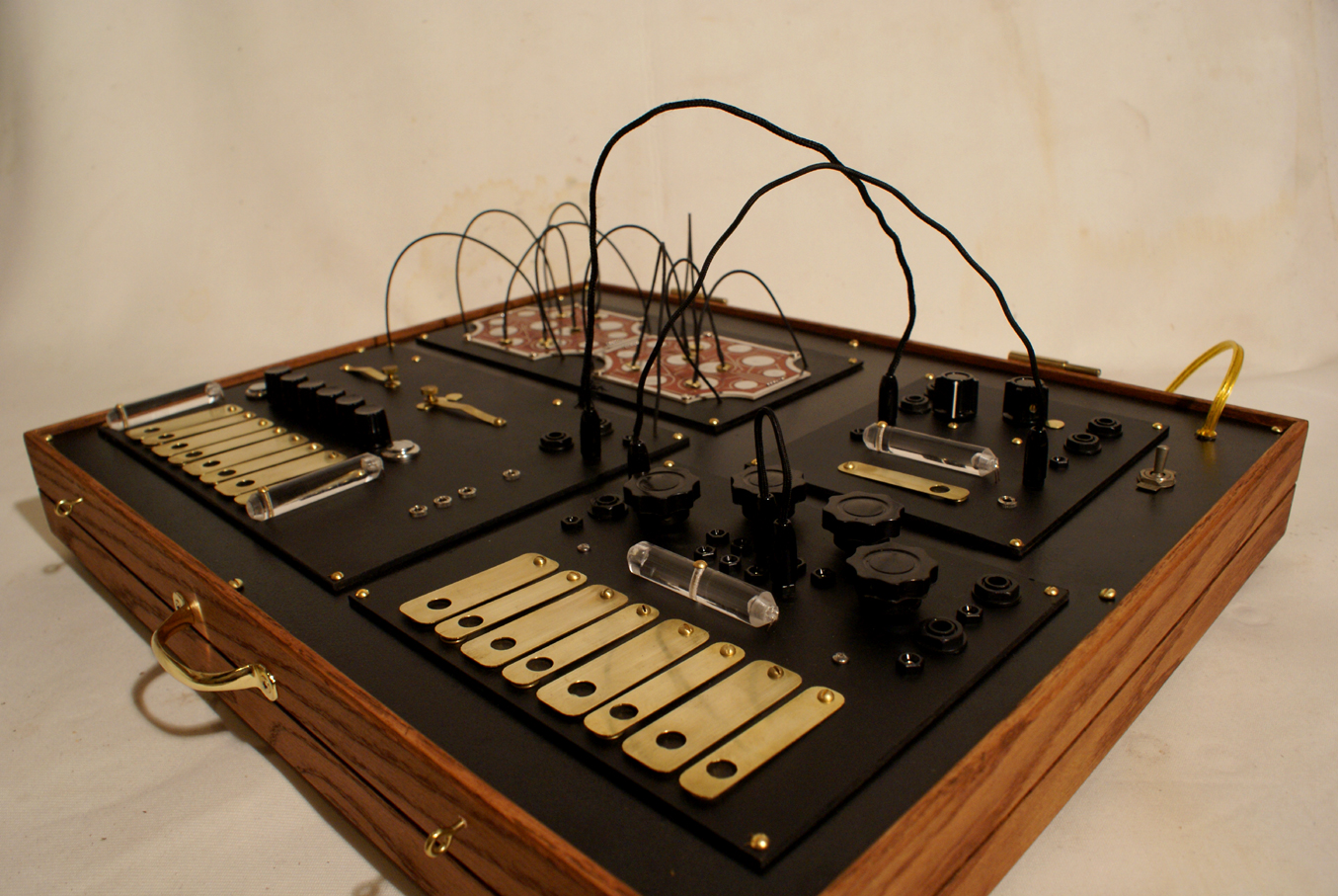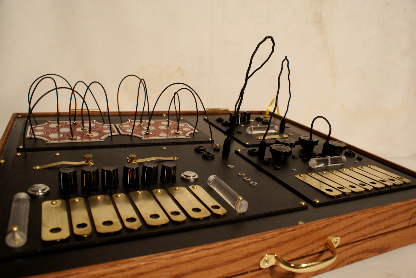 The time shifter built on comission. A piece encompassing the Time Machine, real time pitch stretching like that of the Golden Keys and the pitch shifting of the Mobius Harmonizer. Complete with magnetic patchbay for the time machine keys, CV controls over certain functions, several clock outputs from the time machine section, onboard patching of ins and outs and internal power supply. The box is made of oak and has a handle and removable lid.