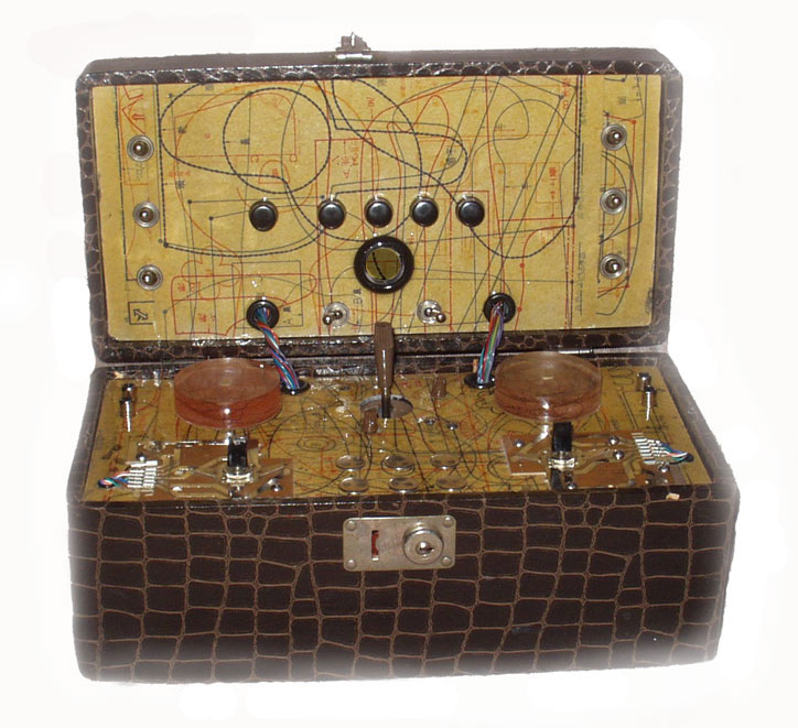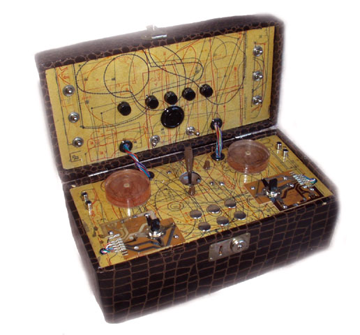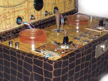 Adding a couple more controls, but most importantly a 1/4" trigger jack to allow the internal synth to synch with an external sound source. The Intereactor encomposes everything the New Moon and Moon Units were capable of and redefines and amplifies it's capabilities. It is the revision of the older works and the next step in my own instrumental artistic development. I used almost all vintage parts in the creation of this piece - right down to the wire that's climbing out of the box. A digital synth with analog style and controls encased in a fine vintage faux alligator skin box. :details: - Joystick:: controls total of 4 intermixing parameters - Optic Eyes (2)-(with switches):: play pitch and cutoff - Switches (6):: Introduce global changes in the sound (distortion, resonance, feedback, Main Pitch, low battery sim. etc.) - combos will have very different effects is some cases - Touch Sensors (6):: To be played in any combination to act as human contacts (makes the player the resistor) - body temperature, moisture level heat and pressure all determine the ammount of resistance for the effect being played. Each combo works like a knob to introduce a number of odd effects from pitch and resonance to distortion and wierd glitches...