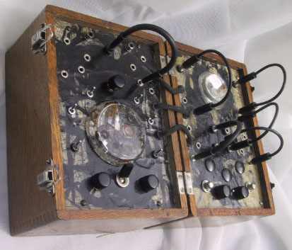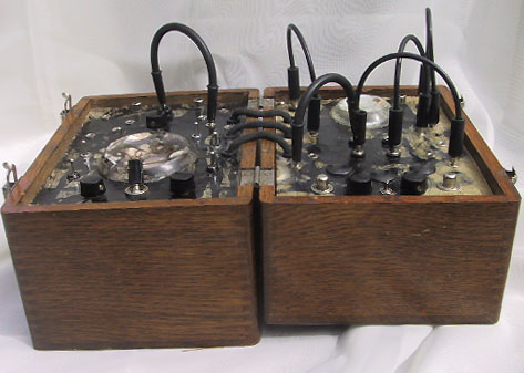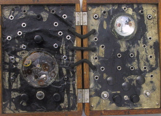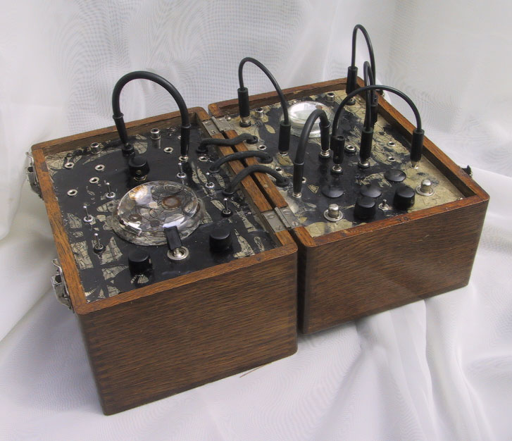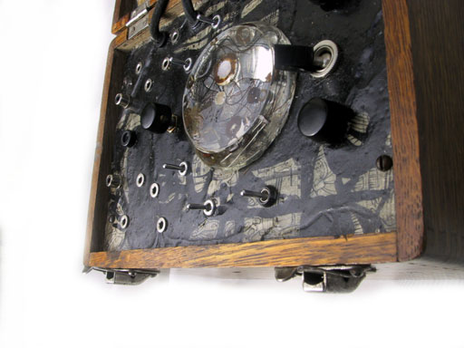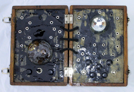 Shock Therapy The shock Therapy device is housed in what was once a medical shock therapy unit back in the 20's or earlier. Both control panels are custom pen and ink, wires travel through cloth covered cable to allow the 2 parts to interact. Both the dome on the left and the one on the right are glass topped and surrounded by resin - each glows white, and each contain a number of optic eyes. The shock therapy device is an optic eye controlled synth. Amongst other controls, the primary method for altering internally synthesized sounds, or the effects section (which alters either an incoming sound from an external source (ie drum machine), or internal synth section) is the amount of light the eye detects...The pitch of both the synth section (left), or the effects section (right) is controllable optically and the effects section controls are completely determined by patch cables...So the effect the eyes will control is determined by the player.