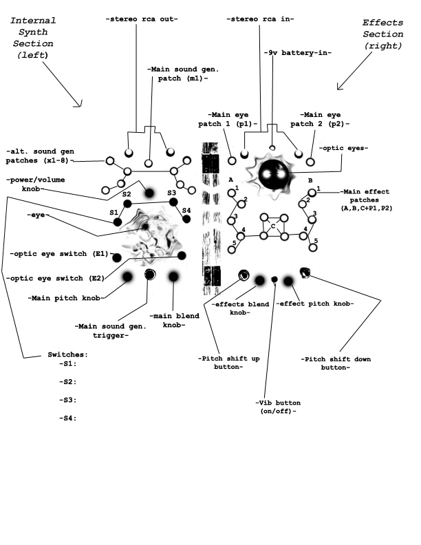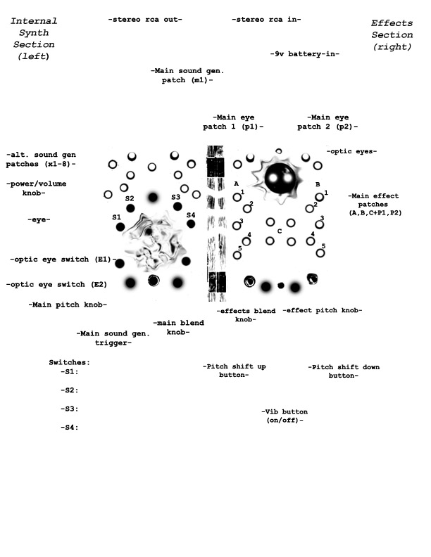 The synth section creates waves, occasionally dueling with modulation...It has controls for distortions, optical played pitch from extremely low to very high (adjustable), modulations controls, noise generation, and the ability to have the effects section alter the synth to great degree... The sounds are sometimes soft and subtle and at others loud and insane...It is a device that is ever changing - though the basic foundation for any sound or effect can be reestablished again and again. The work of art is not in just the physical presentation, nor in just the sound...The piece in it's entirety is the only way to understand what it represents...it is something ancient and decomposing made to be alive and ever-changing...it is compost - future relics - ancient remnants