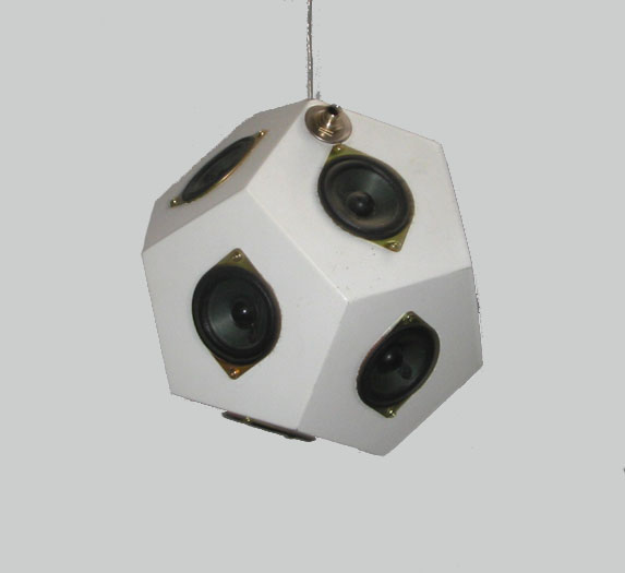 This piece is a amped half dome speaker unit for arctic exploration or use in igloo dwelling sites. Utilizing the platonic solid the dodecahedron this unit sprays out the sound omnidirectionaly for listening in diverse sectors of the space. The housing is wood and brass and features four two inch speakers. Comes with adapter.