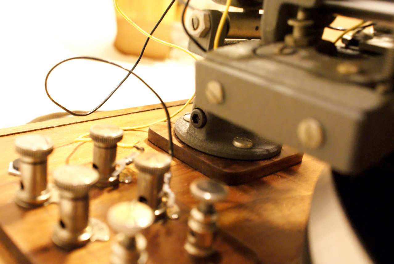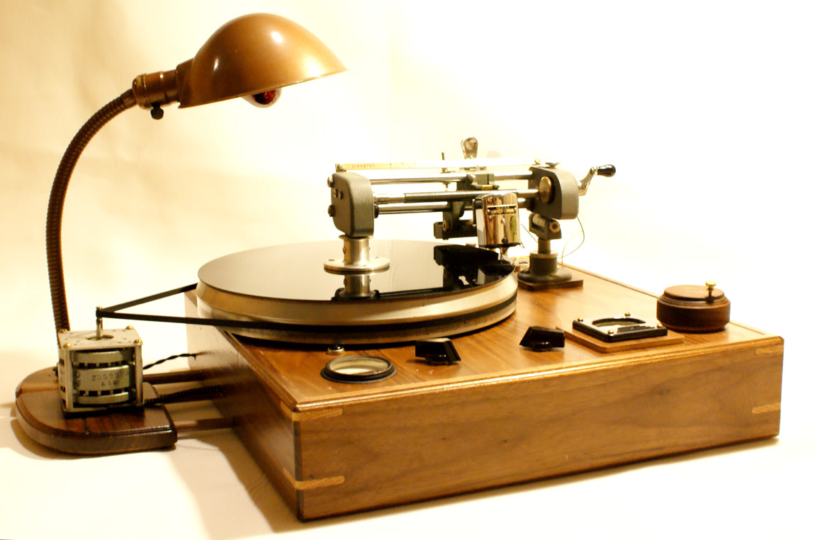 Record Cutter (Lathe) constructed by me (Arius Blaze) based around rek-o-kut Challenger. The plinth (box) and top panel are creamy and delicious walnut with oak splines, DB meter to check incoming level, heated stylus with milla-amp meter and adjustment control, stand-off motor with adjustable belt tension, rek-o-kut cutterhead assembly with freshly re-wound Audax cutterhead, cork covered platter, antique silver ins and connections and all cloth covered cables.